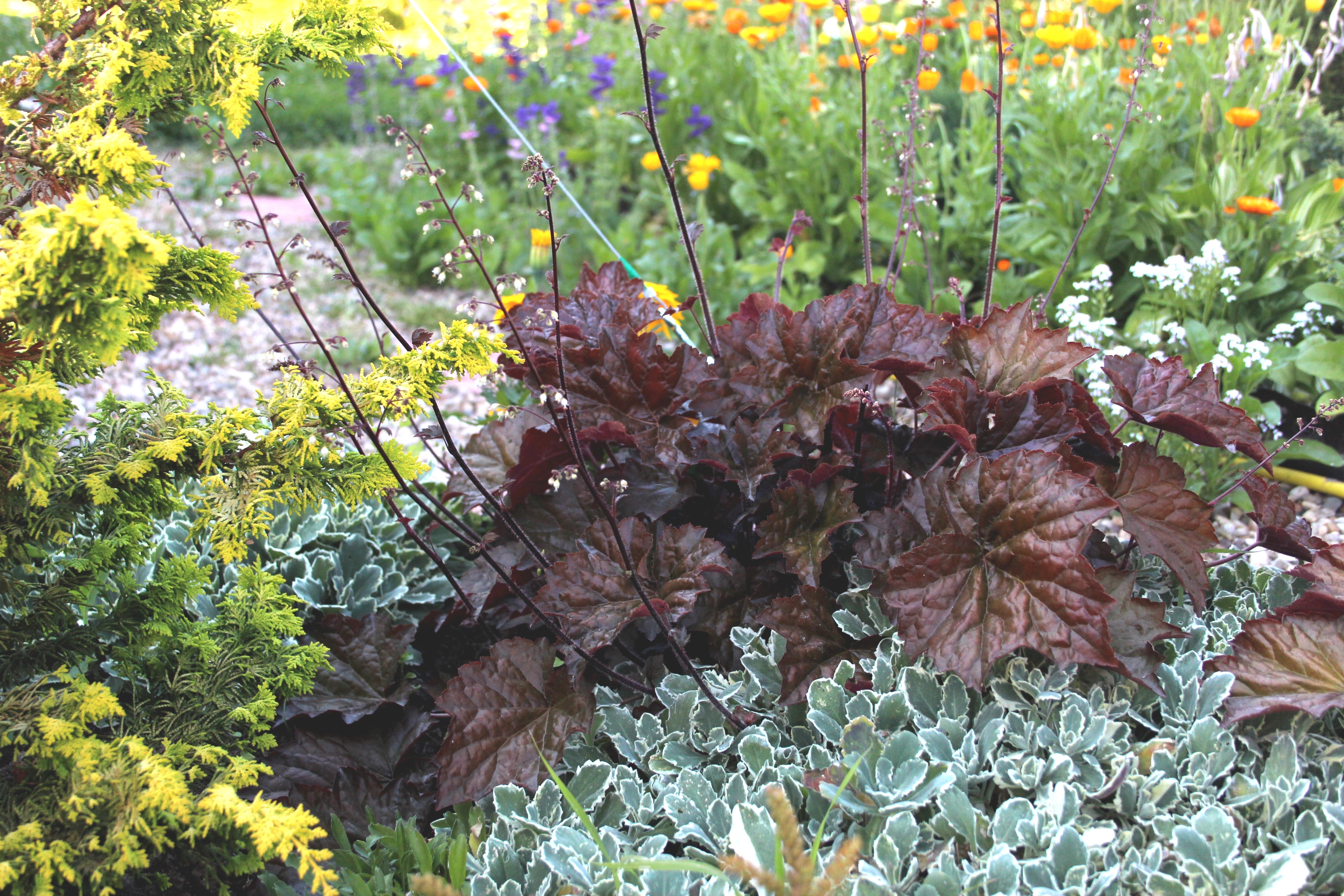 Одним из самых лучших садовых растений считается гейхера (Heuchera) из семейства Камнеломковые (Saxifragaceae): в ней гармонично сочетаются эффектные яркие листья и легкие ажурные цветки.