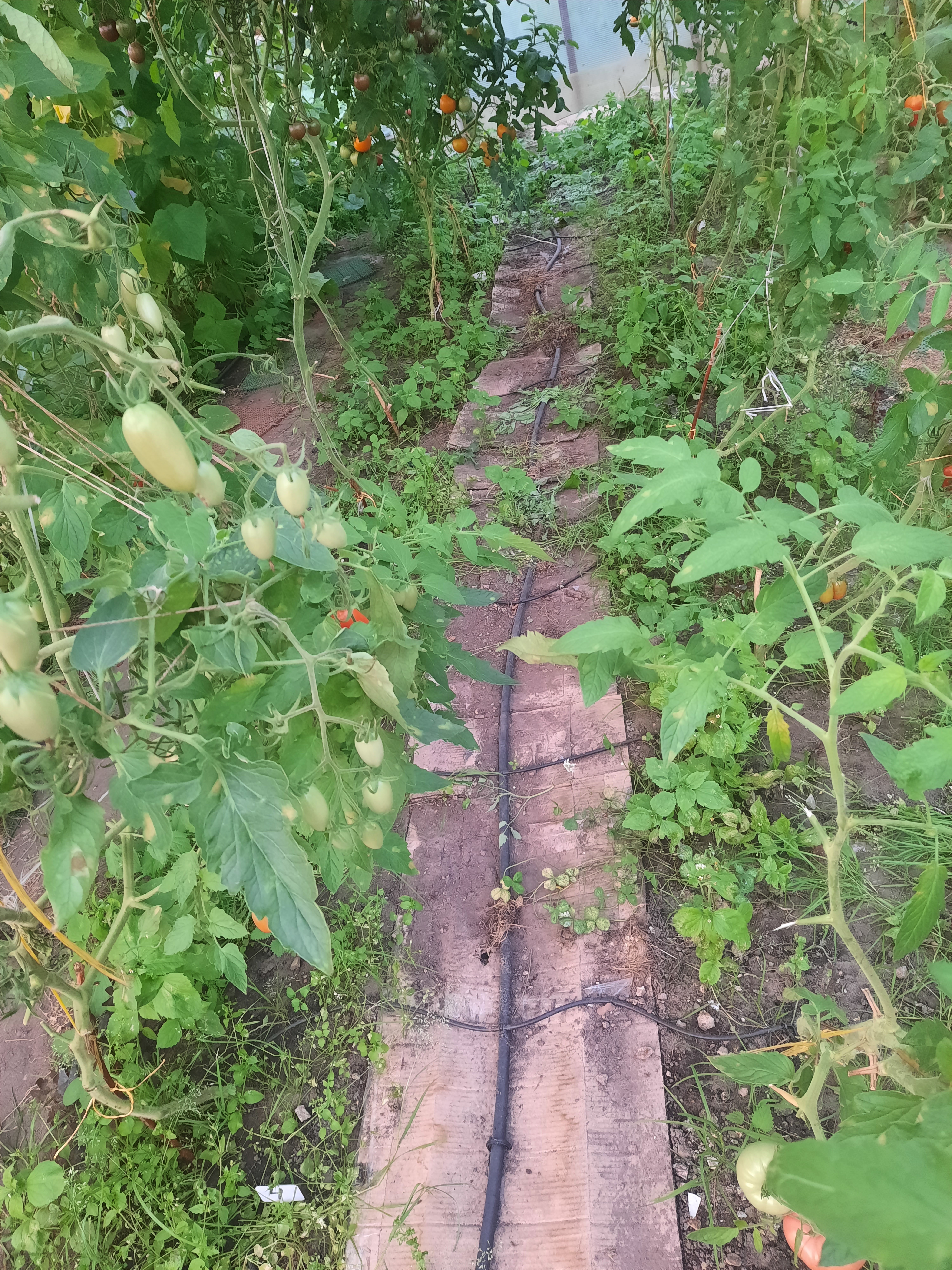 Это очень мне помогло, когда я в июне уезжала в отпуск на три недели. Никого сильно не напрягало раз в три дня зайти и повернуть в теплице кран. Концы основного шланга вот так пережаты, и живительная влага поступает строго к растению. Вокруг грядок сухо. Поэтому сорнякам в проходах было совсем некомфортно, и они медленно росли.