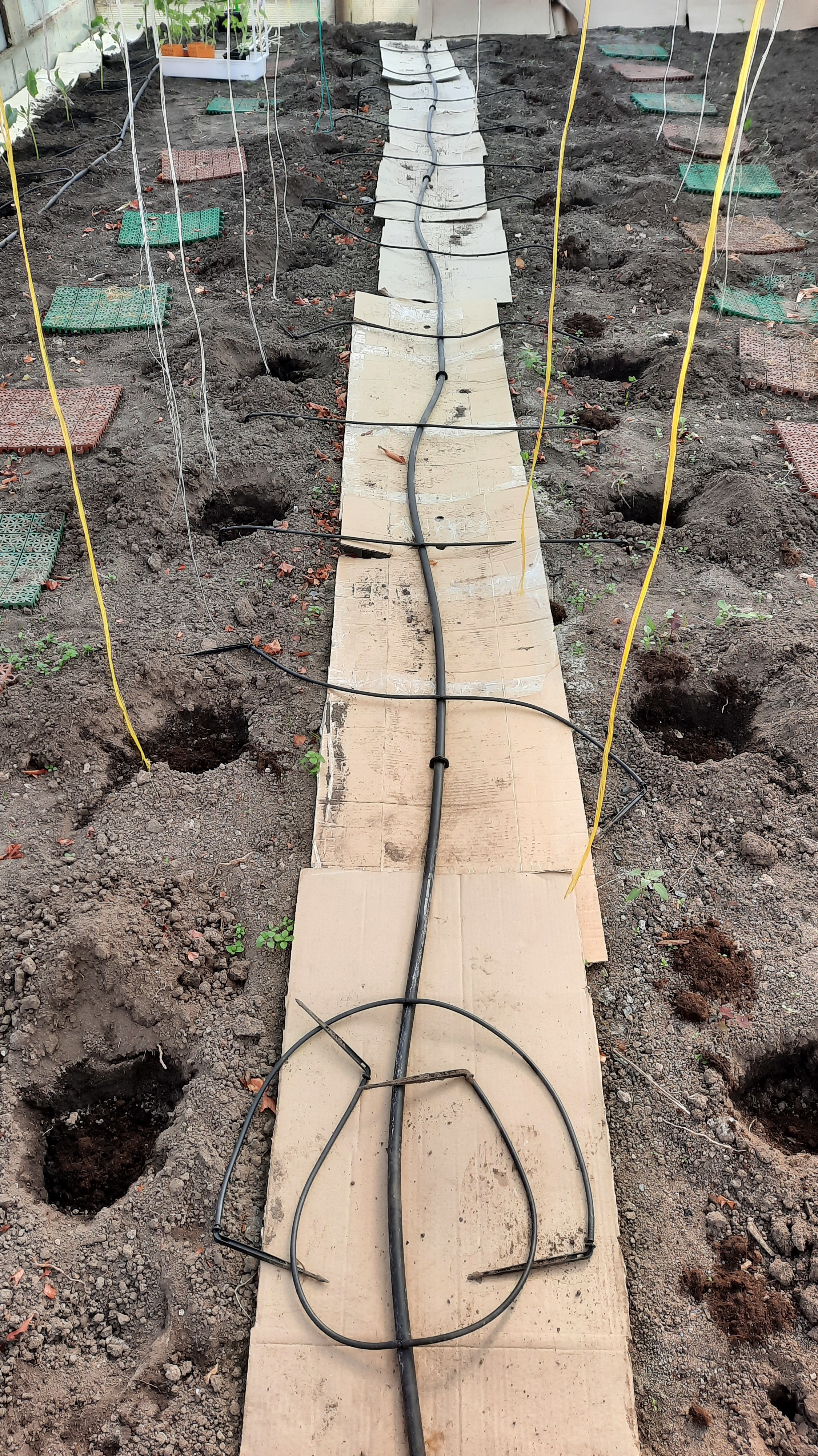 Вначале я разложила составляющие на земле. У меня система российского производителя «Жук». Рассчитана на 60 растений. Потом примерно прикинула, где именно и сколько корней томатов и огурцов я собираюсь размещать. Под главную ветку (трубка-шланг) я подложила картон. Это совсем не обязательно, но с ним чуть легче ухаживать впоследствии за овощами. Распределила отводные трубочки с капельником на конце. Каждому растению досталось по трубочке. Все составляющие и переходники были в комплекте. Конструкцию мне подключили-присоединили к бочке с водой. Она поднята над уровнем земли примерно на метр. Раньше я могла брать лейками воду и поливать теплицу. Сейчас совсем другой расклад.