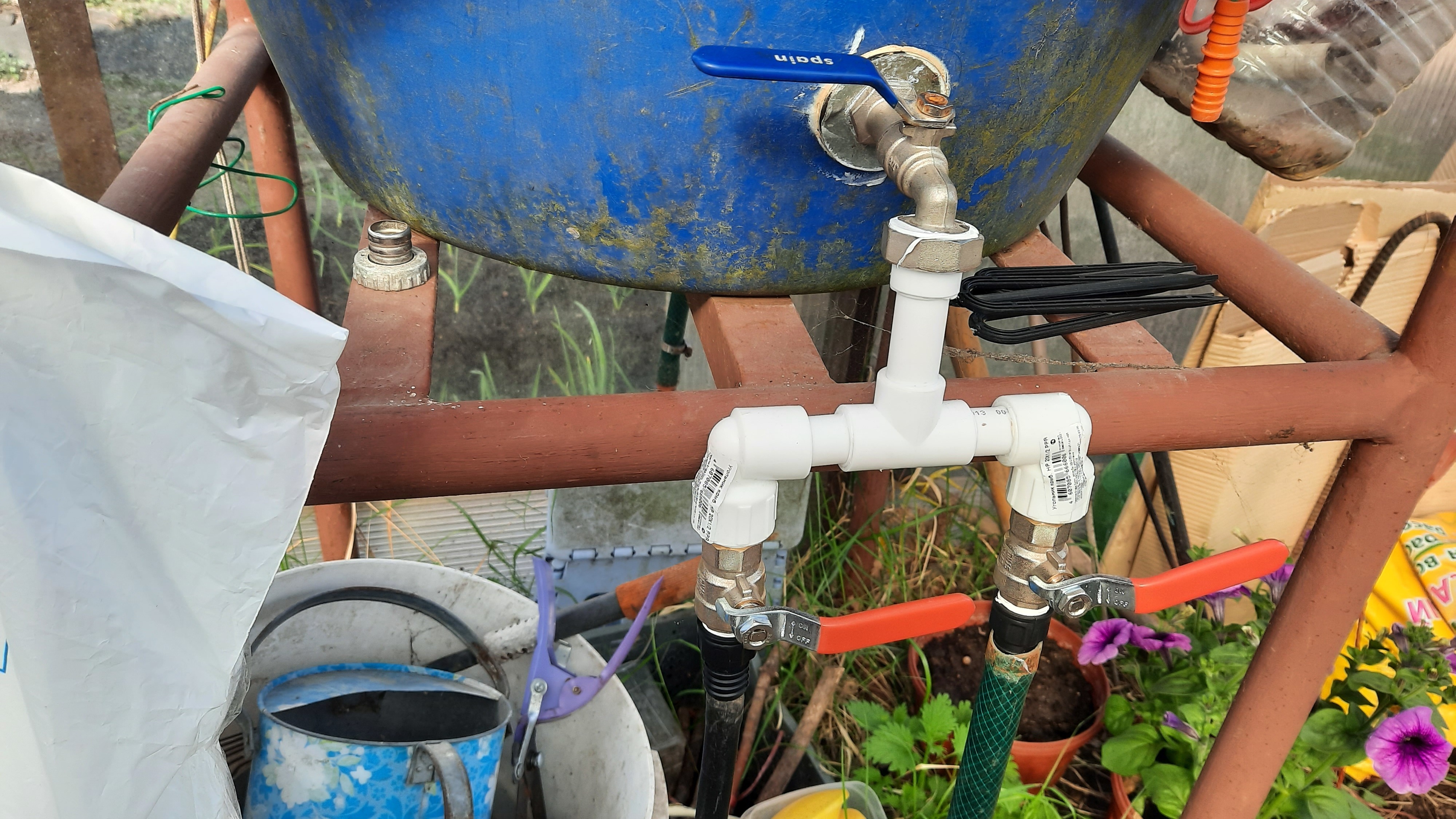 Бочек теперь две стоит. Литраж одной не рассчитан на размер теплицы. Двух вполне хватает для хорошего полива тёплой отстоянной водой. Подводные конструкции мне помогли соорудить. Там металлопластиковые трубки, переходники и краны.