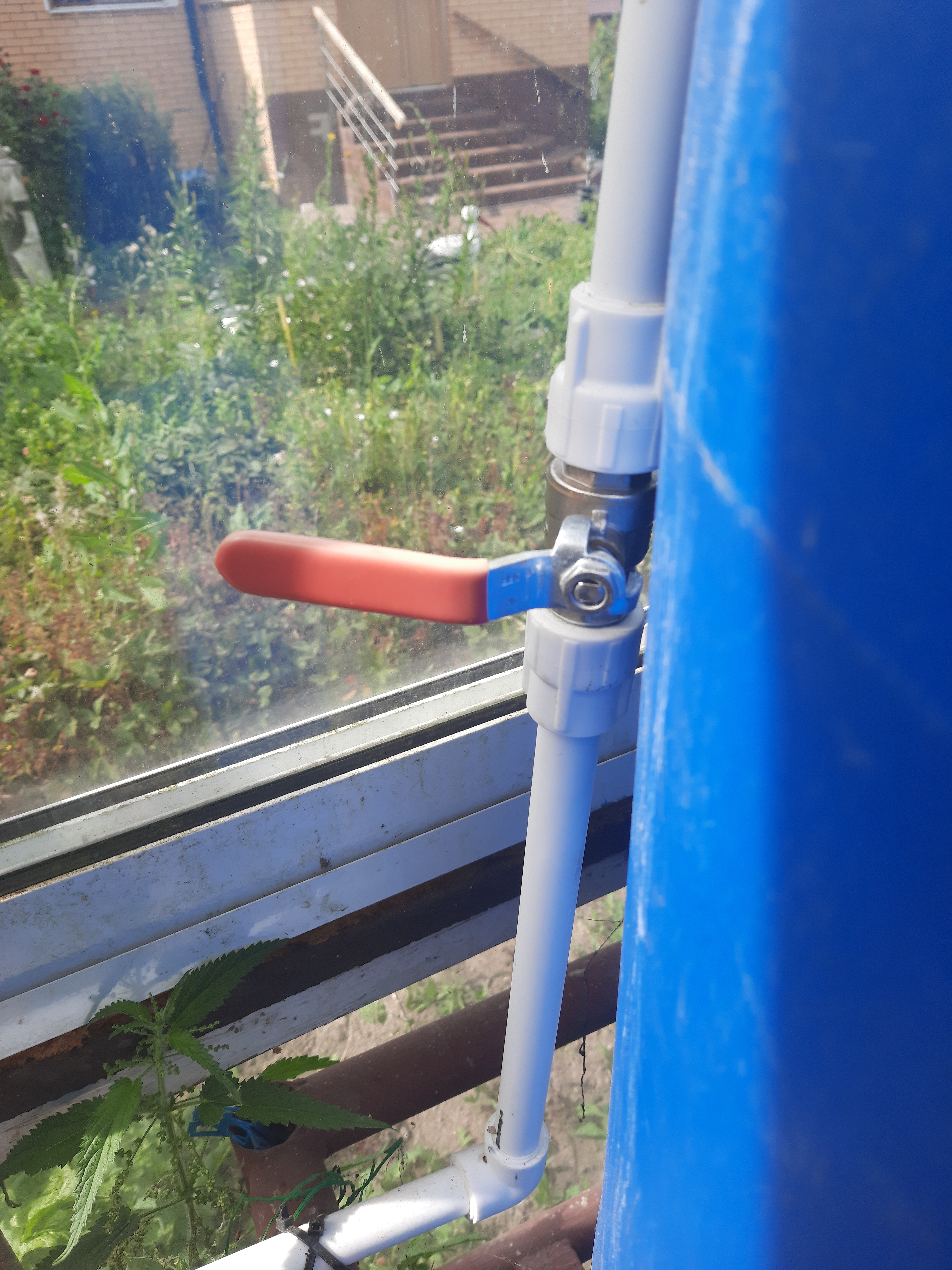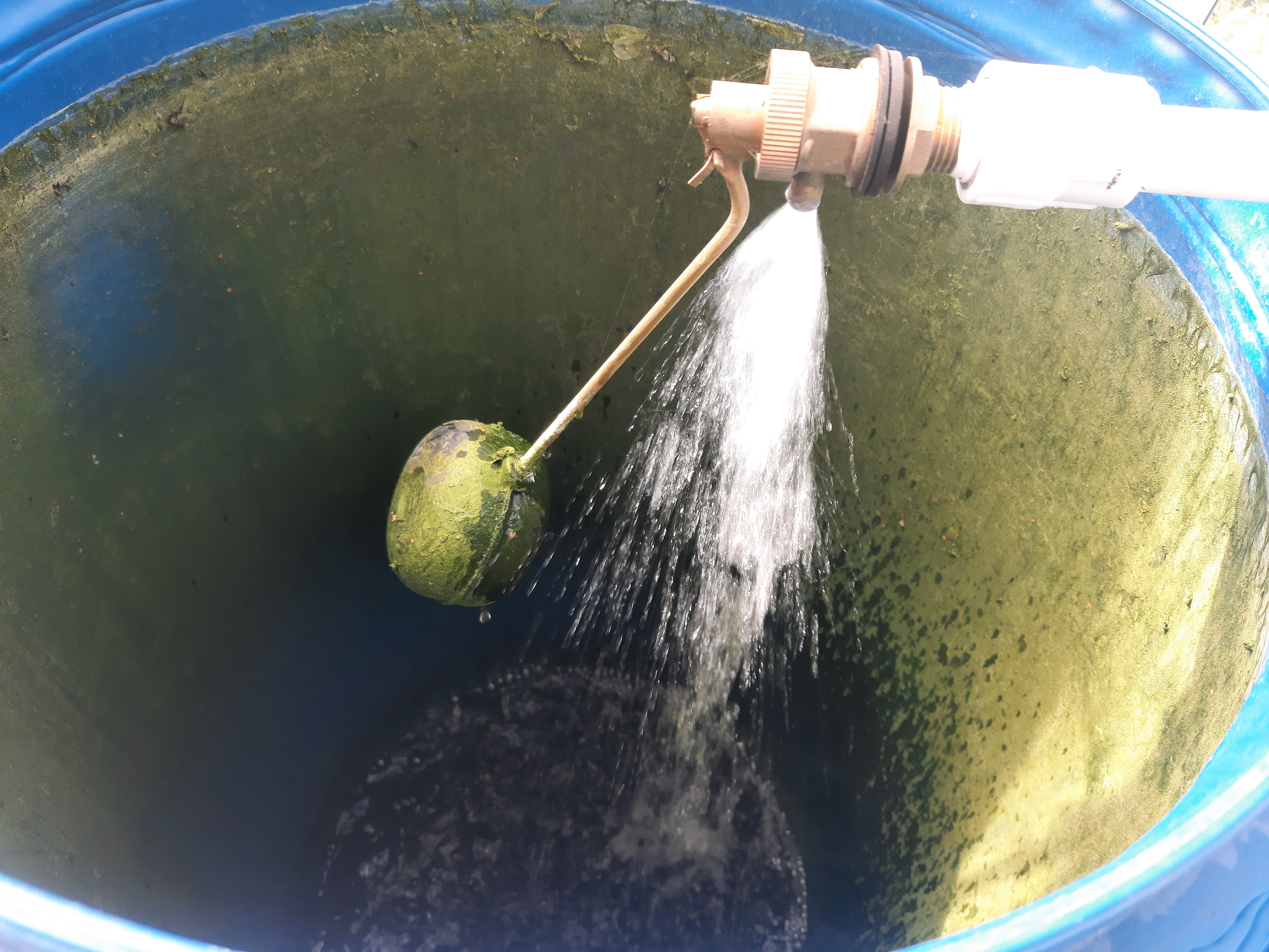 И тут очень понадобилось дополнение в виде контроля за переполнением (переливом) для каждой бочки. Раньше мне приходилось следить и отключать, когда воды достаточно. Но к большому моему сожалению, уплывало всё вокруг через раз. Так как памяти совсем нет. Открывала кран и уходила. Так было нельзя. А сейчас — можно! В каждой бочке на подающую воду трубу мы приспособили поплавок с клапаном. Купили не специальные, а боковые, как стоят во многих бачках унитазов.