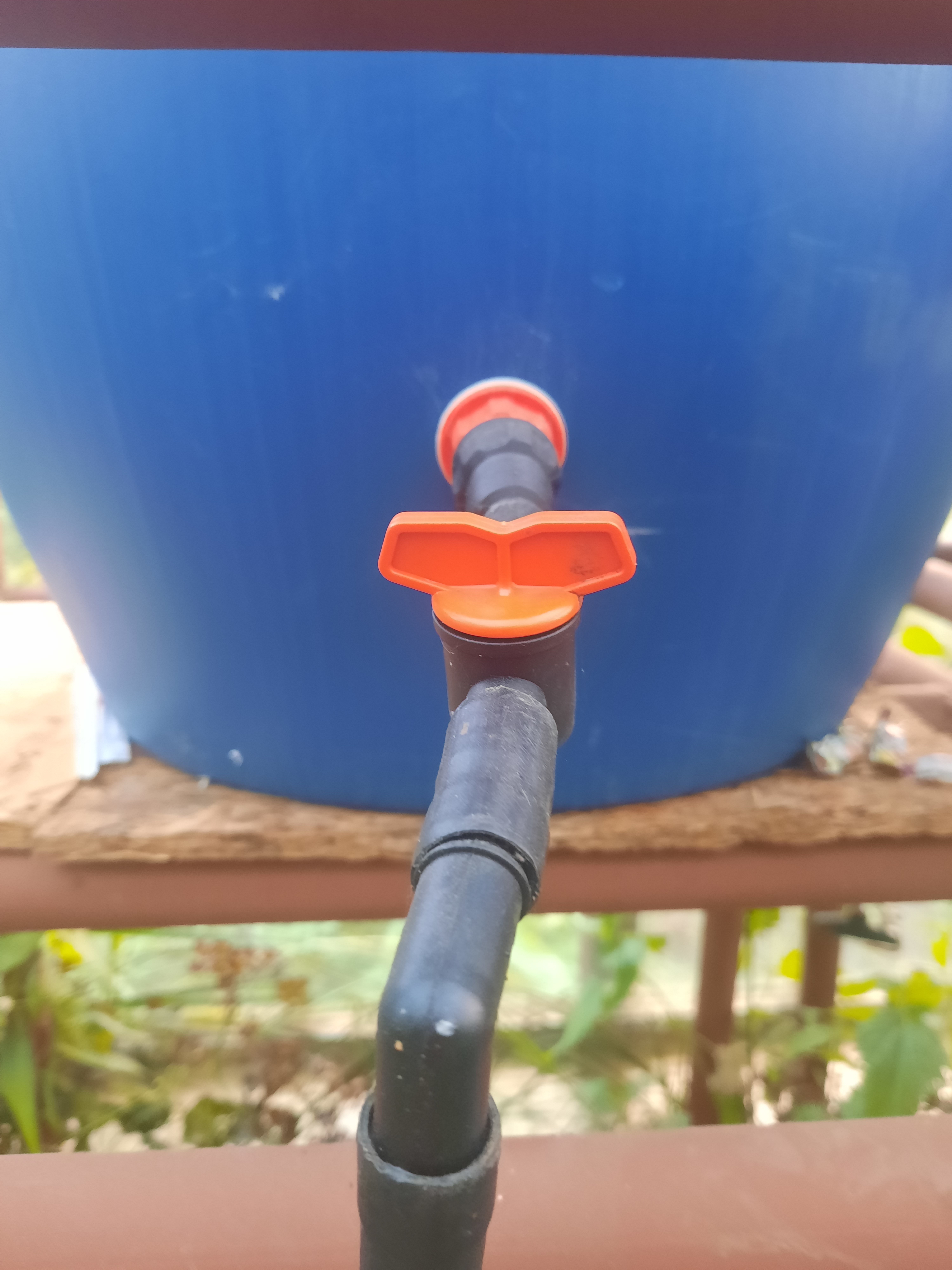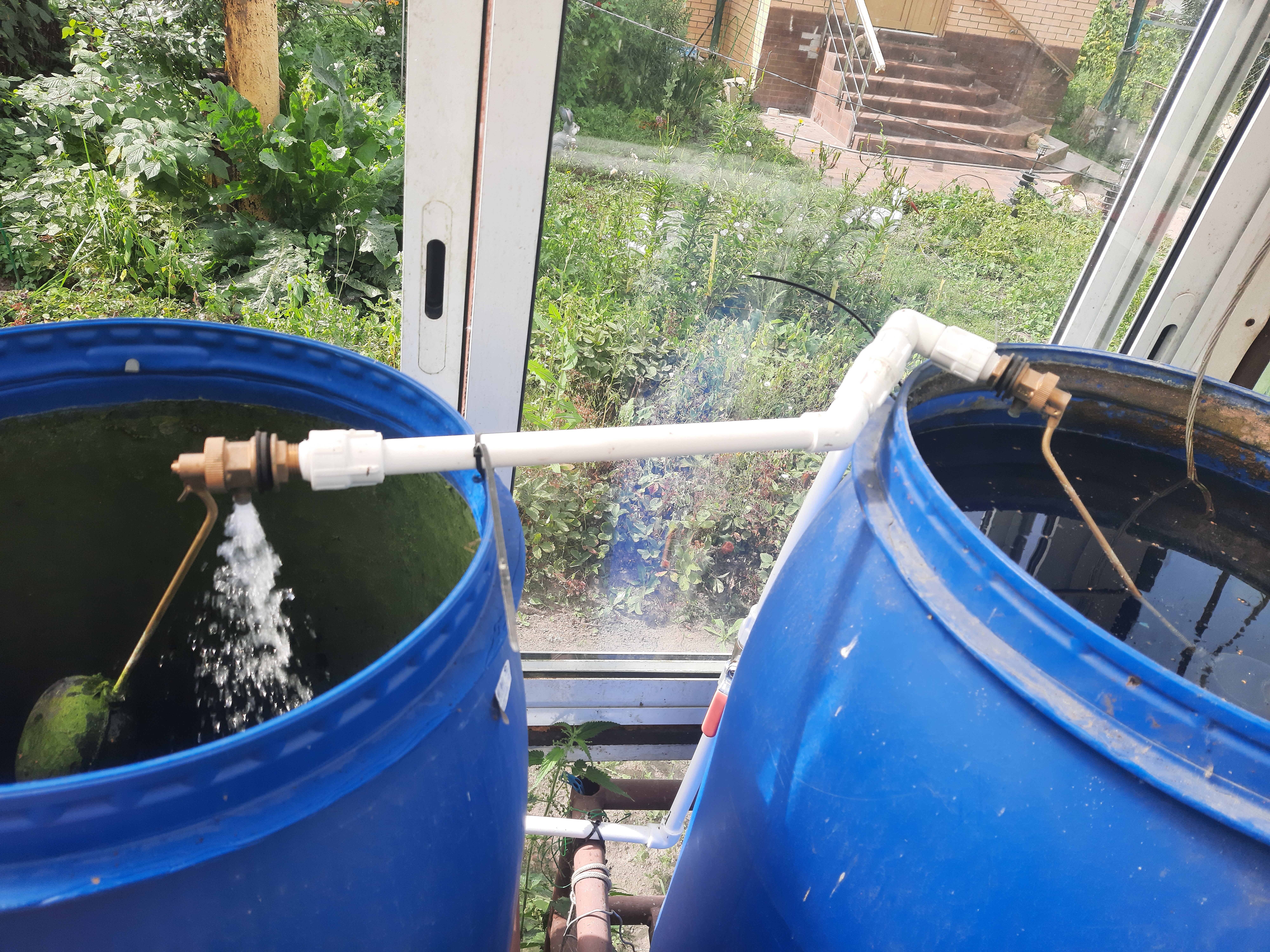 А ещё теперь у налива бочек есть система самостоятельного постоянного пополнения. «Перпетум мобиле». Можно так сделать, что они опустошаться никогда не будут. Вода из скважины подаётся до наполнения обеих.