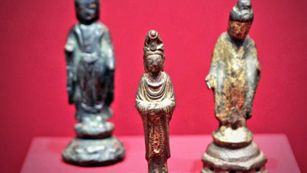Фигурки Будды и двух Бодхисаттв покрыты патиной времени. И не мудрено, ведь это VII век, эпоха ранних корейских государств: Когурё, Пэкче и Силла. Здесь же произведения изобразительного и прикладного искусства, которые корейцы использовали в быту: альбом акварелей, табакерка с серебряной инкрустацией, подставка для кистей из корейского селадона. Нефритовый оттенок керамики ценили даже в Китае.