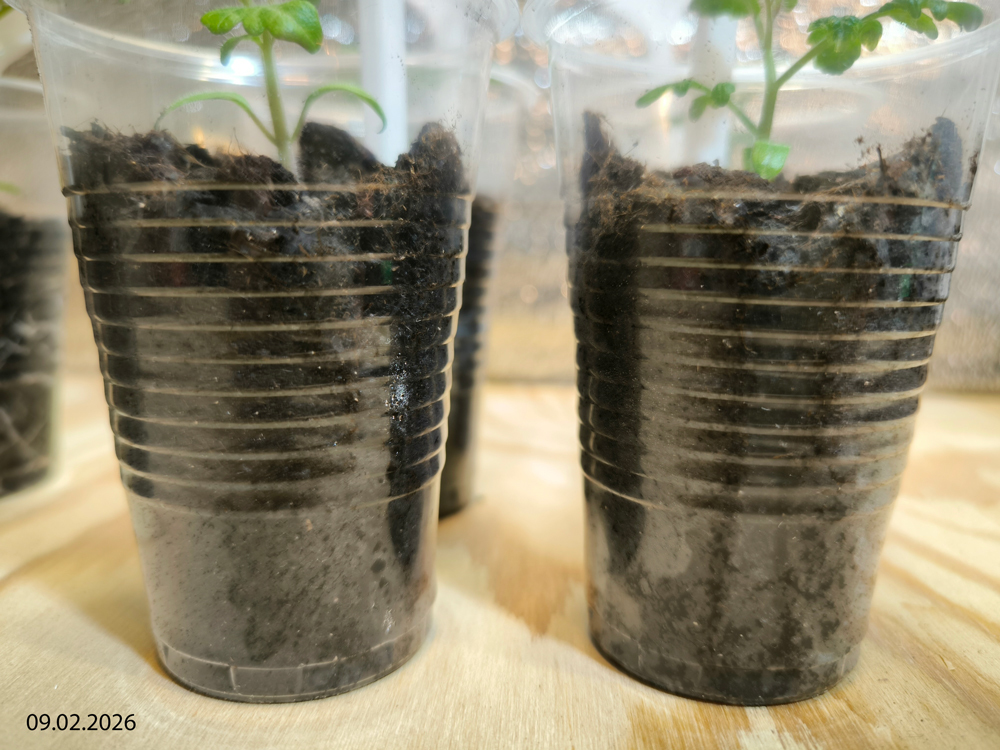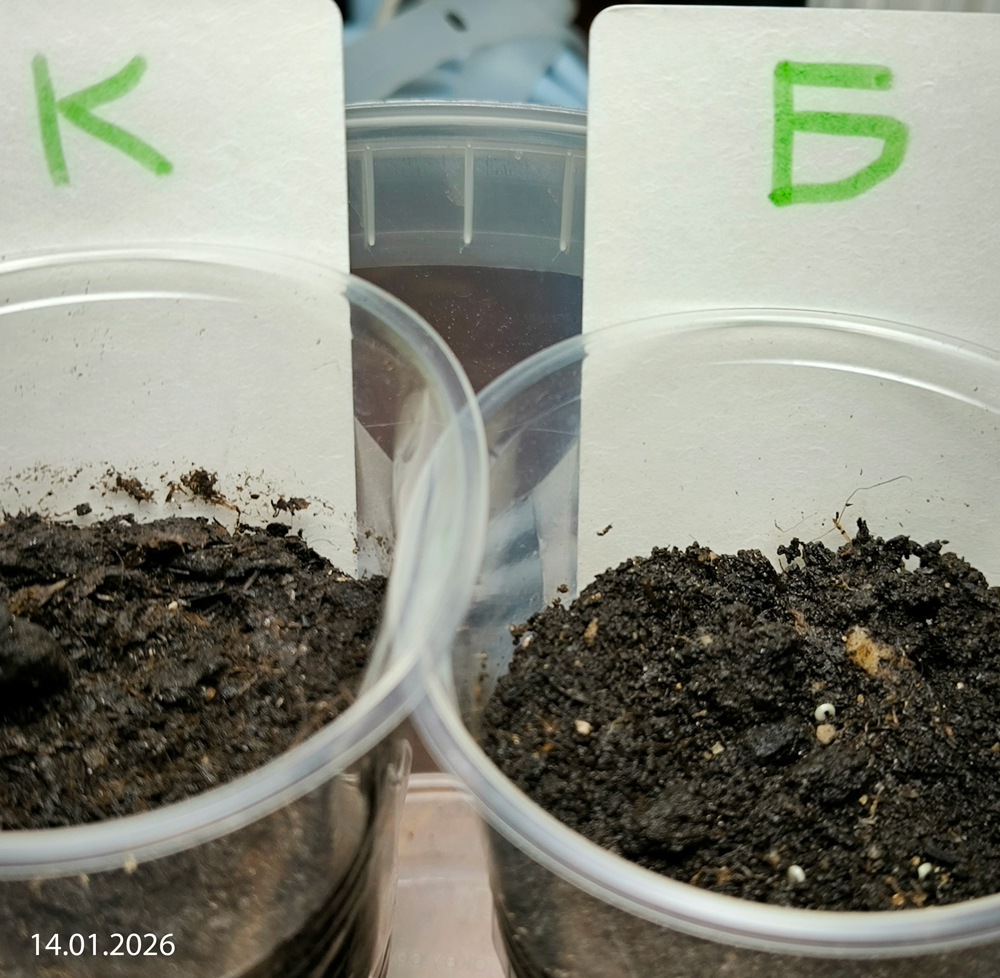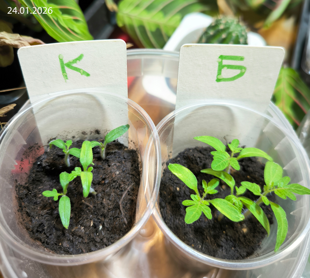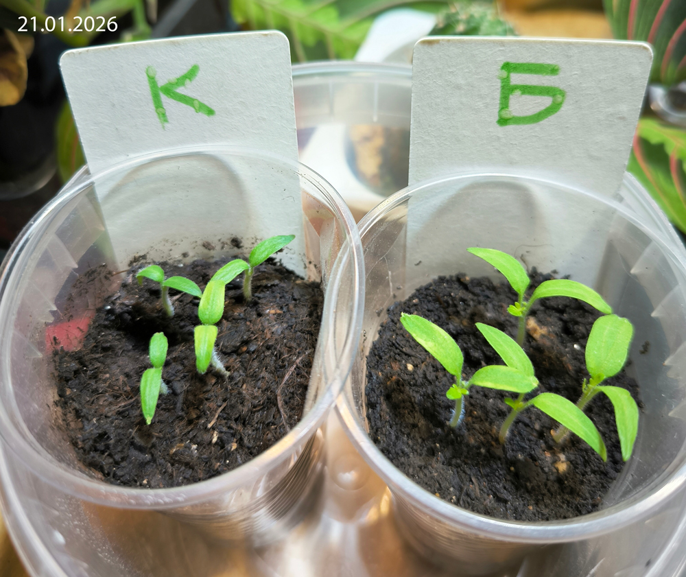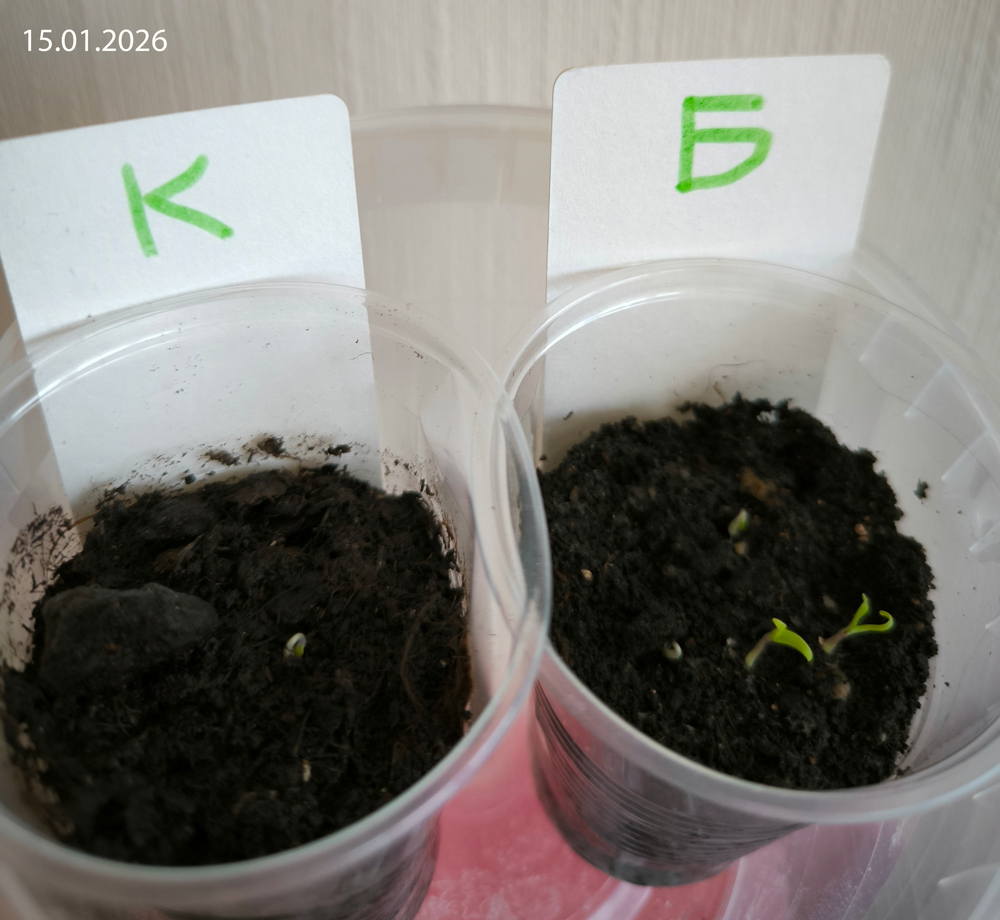 9 января 2026 г. в два стаканчика — один с биогумусом, другой с грунтом, на базе которого этот биогумус был получен (запростецкий «Моррис Грин», упакованный для сети «Перекресток», линейка «Маркет») — я посеяла сухими по четыре семечка. Стаканчики находились рядом в одинаковых условиях (досветка), растения получали одинаковый уход (полив).