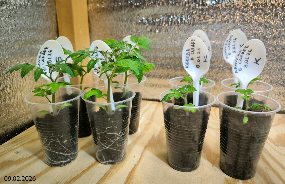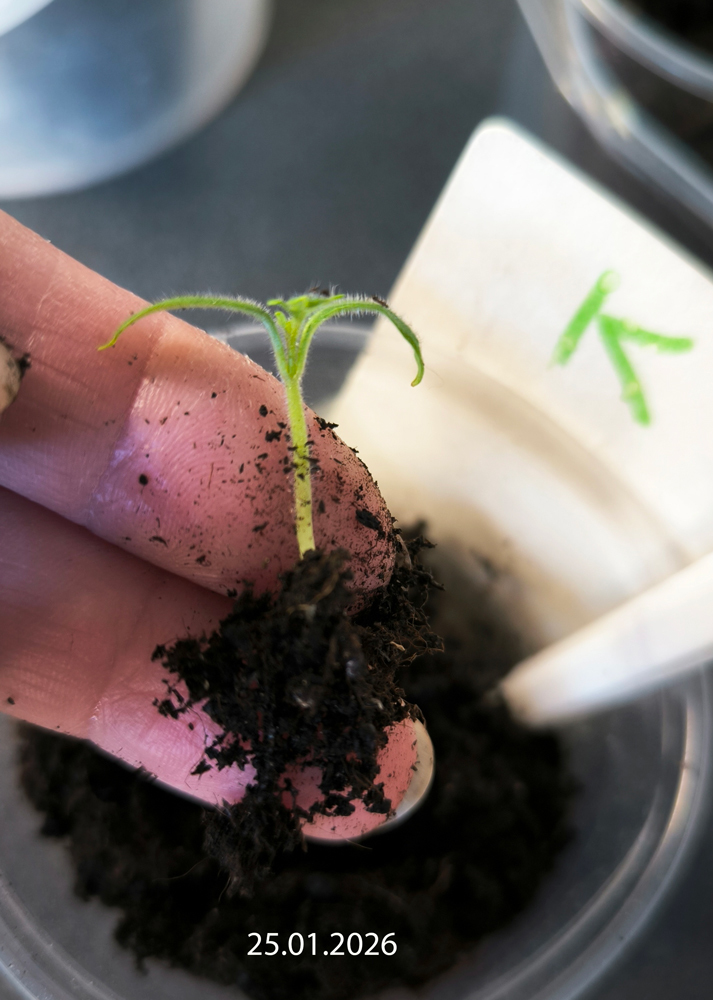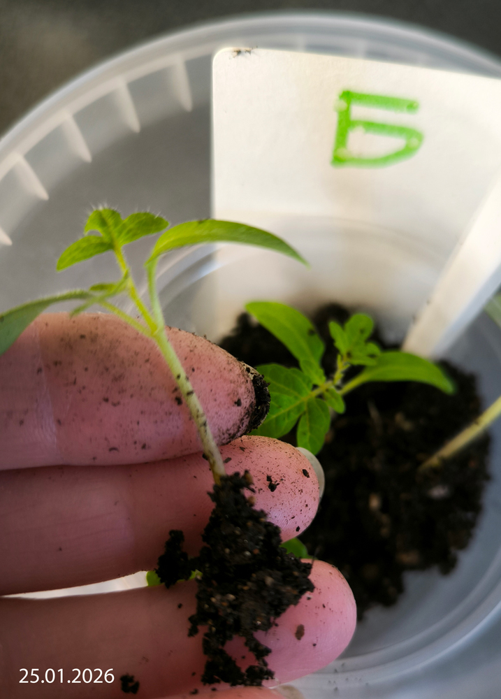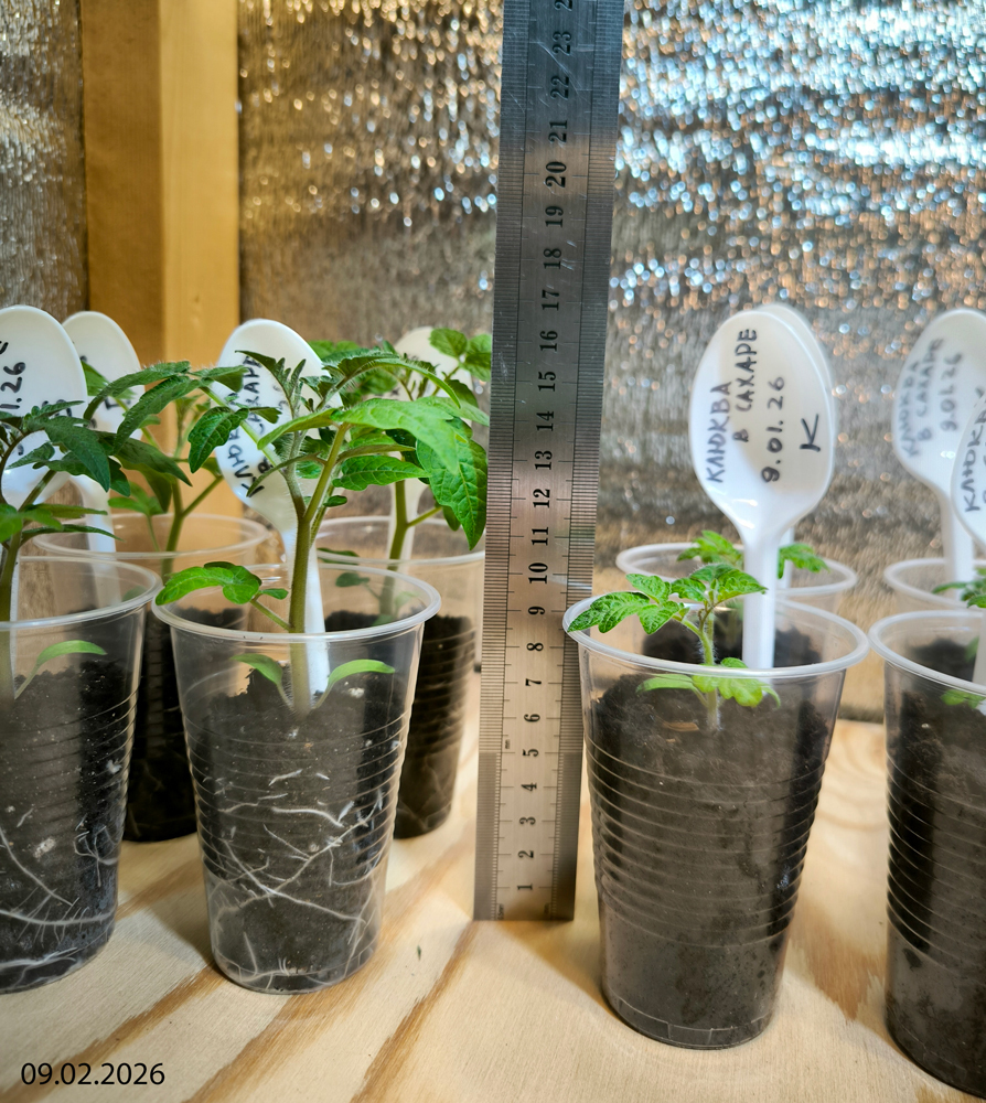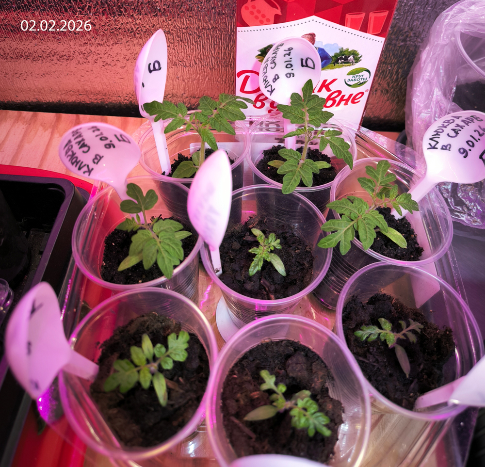 9 января 2026 г. в два стаканчика — один с биогумусом, другой с грунтом, на базе которого этот биогумус был получен (запростецкий «Моррис Грин», упакованный для сети «Перекресток», линейка «Маркет») — я посеяла сухими по четыре семечка. Стаканчики находились рядом в одинаковых условиях (досветка), растения получали одинаковый уход (полив).