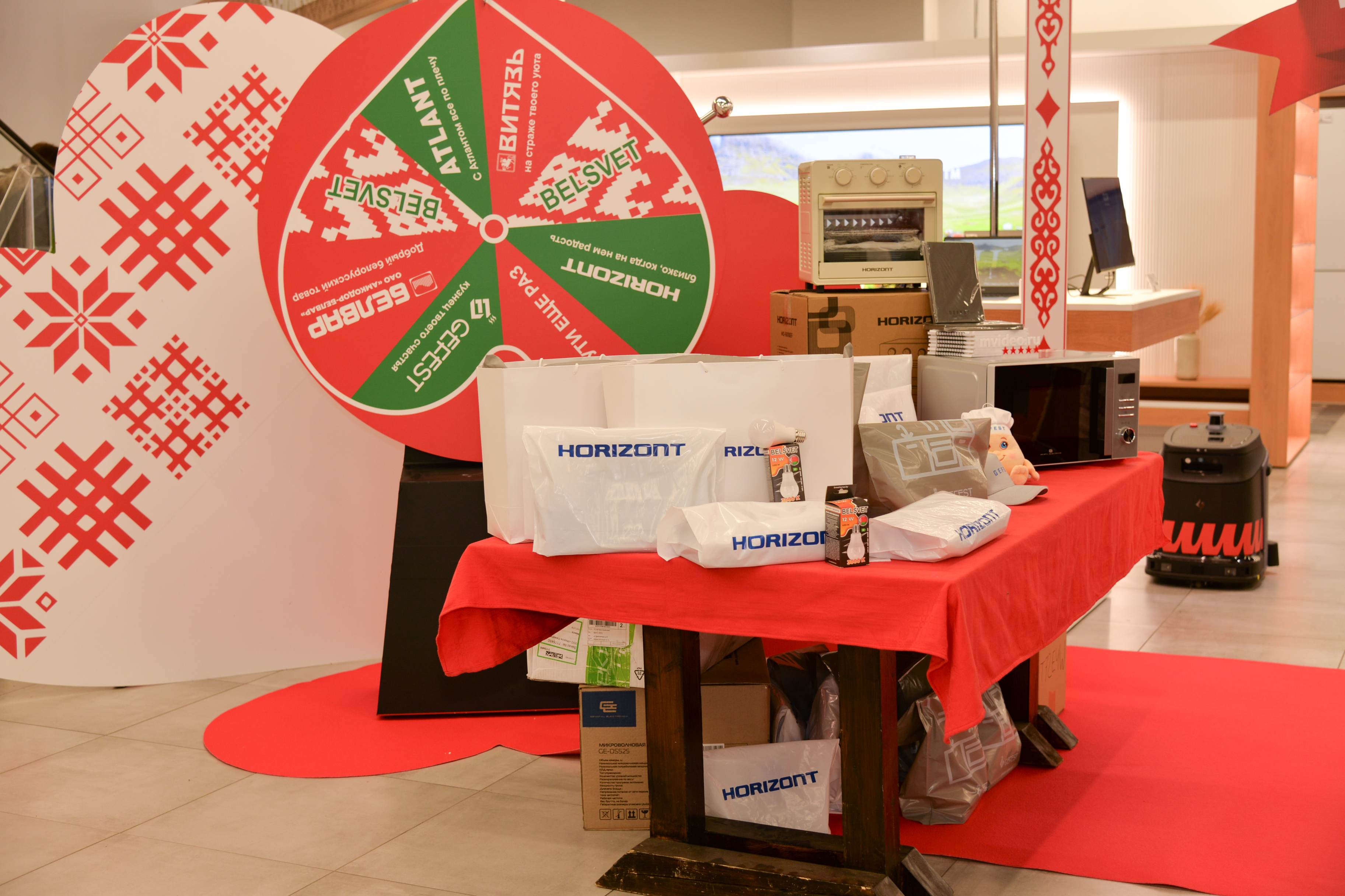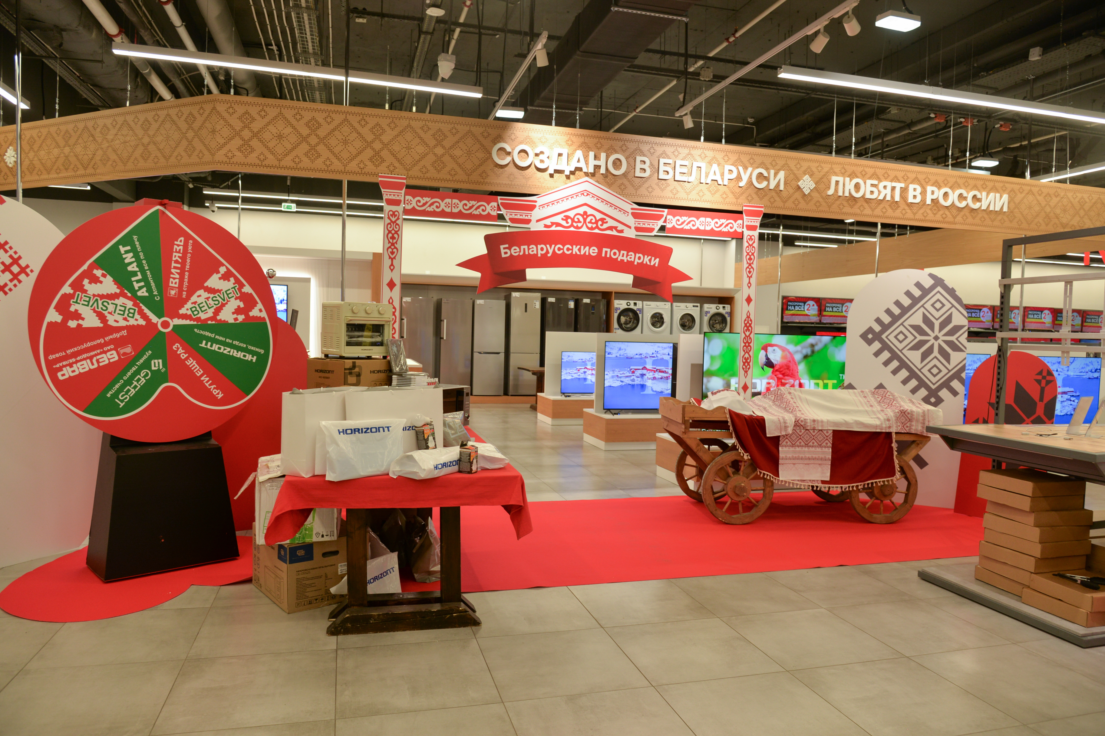 Бренд-зона оформлена в национальном стиле Беларуси. Покупатели могут протестировать технику на месте и получить консультацию.