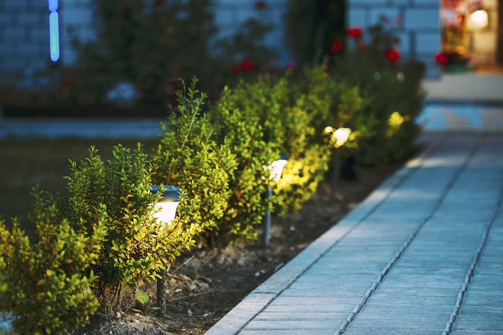 На уровне дорожек установите плоские светильники, вровень с бордюром.Кустарники подсветите фонариками на солнечных батареях.Два-три дерева осветите подвесными светильниками либо гирляндой на светодиодах.