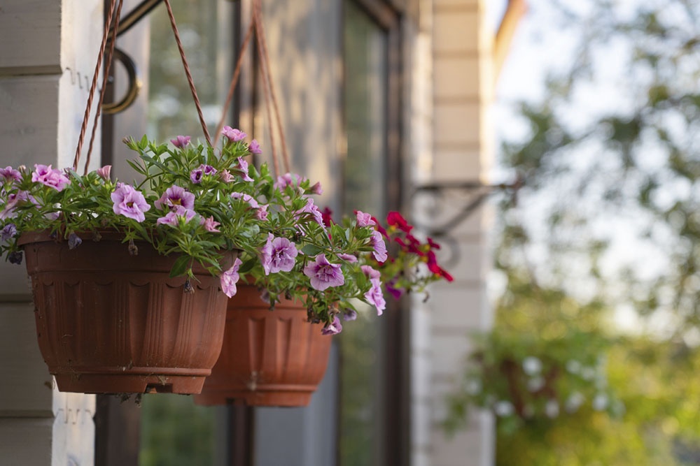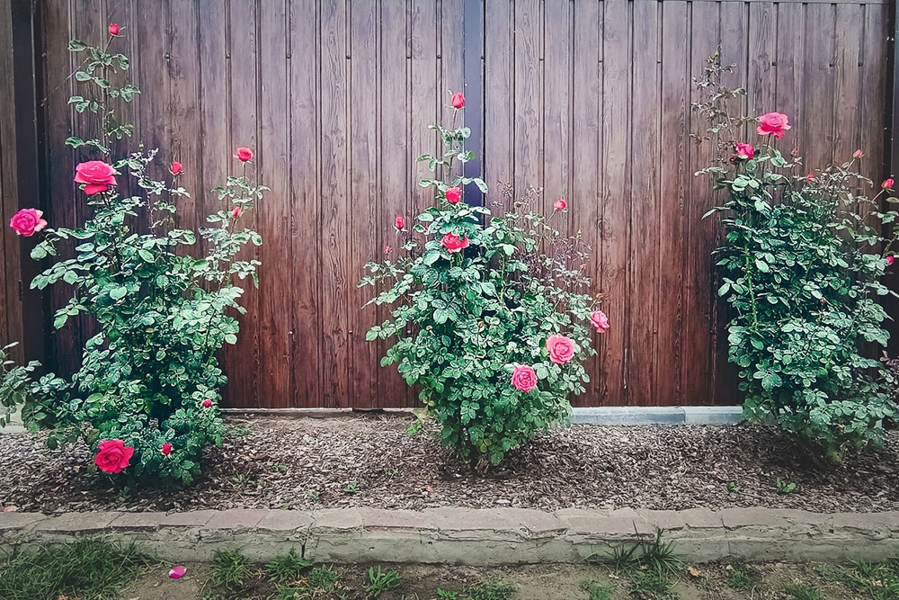 Забор можно закрыть вьющимися растениями - плющом, девичьим виноградом, актинидией. Также на него можно подвесить кашпо с однолетниками.