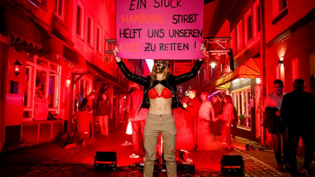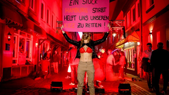 Гамбургские проститутки собрались на улице красных фонарей в темное время суток с требованием открыть немецкие публичные дома. Они были закрыты с целью приостановить распространение коронавирусной инфекции.
