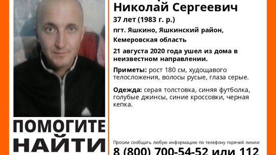 В пгт Яшкино пропал 37-летний мужчина. Волонтеры ПСО "Лиза Алерт" сообщили, что местоположение кузбассовца неизвестно с конца августа. 37-летний Николай Сергеевич Сивец ушел из дома в неизвестном направлении 21 августа 2020 года. Волонтеры обратились к кузбассовцам с просьбой помочь в поисках мужчины. Приметы мужчины: рост 180 сантиметров, худощавое телосложение, русые волосы, серые глаза. Он был одет в серую толстовку, синие футболку и кроссовки, голубые джинсы и черную кепку. Граждане, которые обладают информацией о местонахождении кузбассовца, могут сообщить об этом по телефону 8-800-700-54-52 или 112.