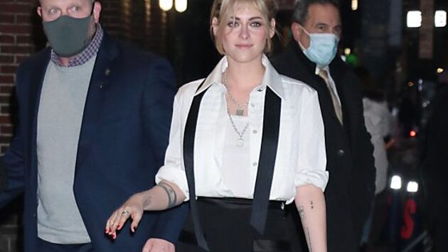 Накануне она появилась в студии в белой рубашке с закатанными рукавами, которую надела поверх майки. Белый верх Кристен сочетала с черным низом. А разбавил строгий образ развязанный галстук.