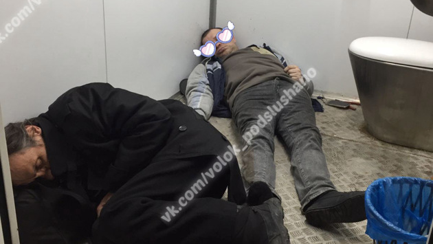Двое мужчин, ночующих в кабине общественного туалета в подмосковном Волоколамске, попали на фото, опубликованные в группе «Волоколамск Подслушано» во «ВКонтакте».