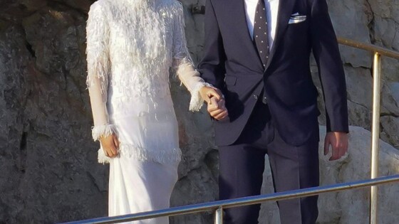 Для церемонии невеста заказала в ателье Chanel не одно и не два, а целых три свадебных наряда. Под венец София шла, конечно, под руку с папой-легендой и в платье с длинным шлейфом, щедро украшенном бисерной вышивкой. Дизайн уникальный: в цветочном узоре скрыты два сердца, а в подкладке — инициалы молодоженов и дата свадьбы.