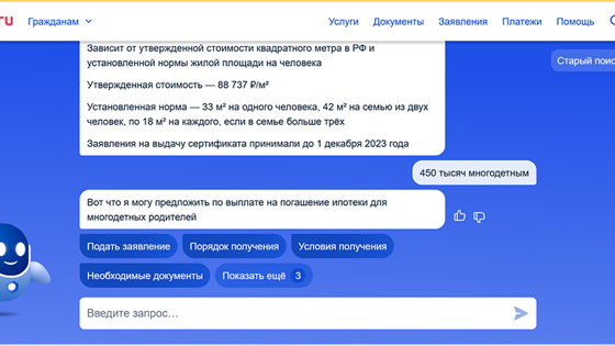 Чтобы найти нужный раздел на портале "Госуслуг", проще всего забить здесь в поиск "450 тысяч многодетным".