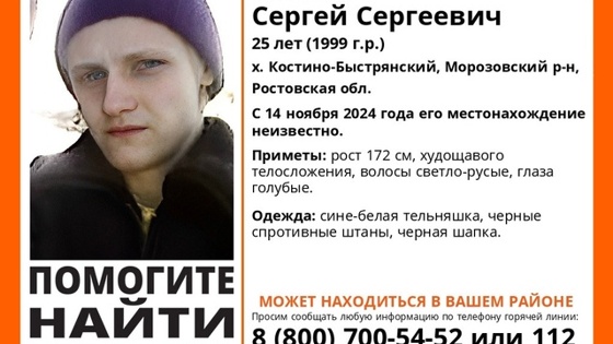 Ростовская область, 20 ноября 2024. DON24.RU. В хуторе Костино-Быстрянском Морозовского района пропал 25-летний Сергей Попов. Об этом сообщили в поисковом отряде «ЛизаАлерт» Ростовской области, уточнив, что местонахождение парня неизвестно с 14 ноября текущего года. Его приметы: рост 172 см, худощавое телосложение, светло-русые волосы, голубые глаза. Он был в сине-белой тельняшке, черных спортивных штанах и черной шапке. Сообщать любую информацию о местонахождении пропавшего просят по телефону горячей линии 8-800-700-54-52 или по номеру 112. По данным отряда «ЛизаАлерт», в Ростовской области в октябре 2024 года пропали 88 человек.