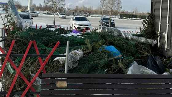 Десятки елок принесли новосибирцы к остановке у ТЦ «Мега». Здесь принимают деревья для утилизации.
