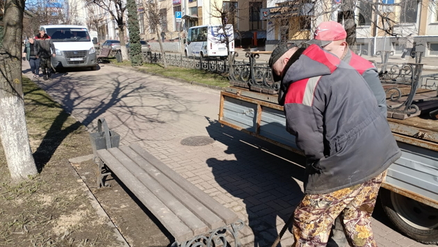 Утром 14 апреля на пешеходном бульваре улицы Кирова в Калуге начался демонтаж лавочек. Вместо них монтируют новые — со спинками. Видимо, будут обновлены и урны: часть старых урн тоже демонтирована. Следующим этапом, видимо станет монтаж белых журавлей. Сотни журавлей будут парить над бульваром на тросиках. Тросики над бульваром натянули на прошлой неделе, закрепив их на арках.