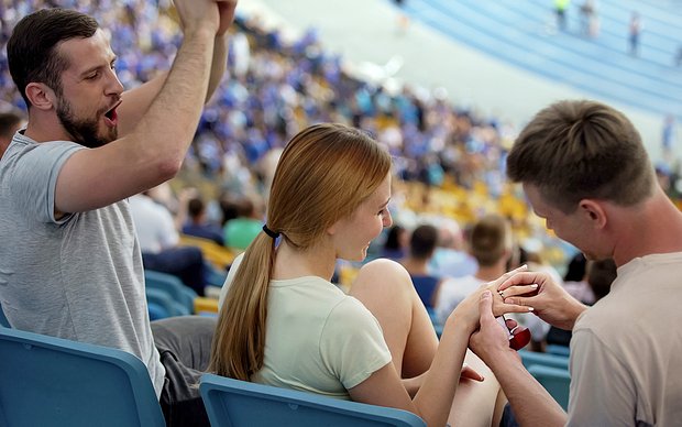 Договоритесь с администрацией стадиона о коротком объявлении по громкой связи во время перерыва между таймами. В назначенный момент опуститесь перед девушкой на одно колено с кольцом в руках и сделайте предложение, разделив этот момент с тысячами болельщиков.