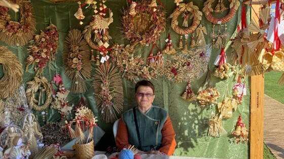 Рядом мастер декоративно-прикладного искусства Надежда Кожевникова. Она 35 лет занимается плетением из соломки. По ее словам, это очень «капризный материал», но она с ним давно дружит и создает удивительно стильные панно, венки и кукол. На «Александровской крепости» она научит всех желающих плести птичек-счастья.