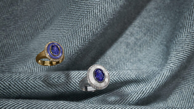 Кольцо с танзанитом и бриллиантами, напоминает старинную технику Фаберже — гильоширование, в более точном визуальном и технологическом исполнении.