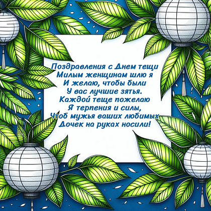 Сегодня весь мир чествует таких женщин, как вы, — бесценных тещ, которые своей заботой скрепляют семью, становясь ее душой и опорой. Мне невероятно повезло обрести в вашем лице родственницу, у которой всегда найдется мудрый совет и искреннее слово поддержки. Вы всегда встречаете нас с улыбкой, вашим фирменным блюдом, готовностью помочь в любой ситуации. Вам — только самого светлого: здоровья, бодрости духа, увлекательных занятий по душе и радостных дней в кругу любящей семьи.