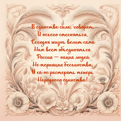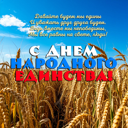 Этот праздник напоминает нам о простой и важной истине — мы сильны, когда вместе. Пусть в наших сердцах живут уважение и доброта к каждому, кто рядом. Наше единство — это не про громкие слова, а про поддержку и понимание в большом и малом. Пусть каждый чувствует себя частью чего-то большого и надежного. Мира и добра нашему общему дому!