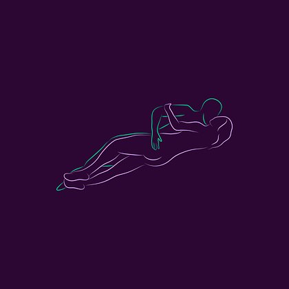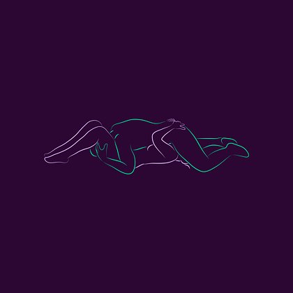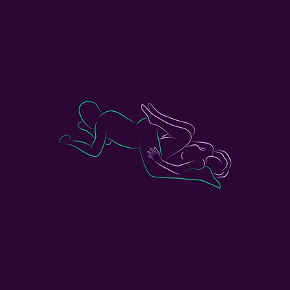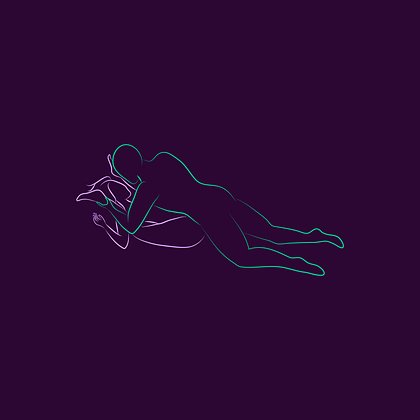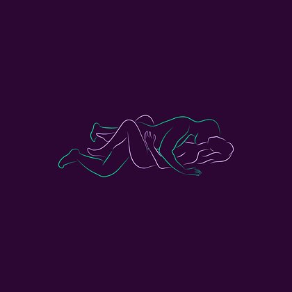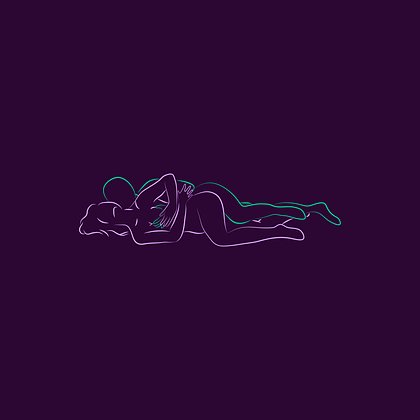 Оба партнера лежат на боку, мужчина обнимает женщину сзади, колени слегка согнуты, тела плотно соприкасаются.