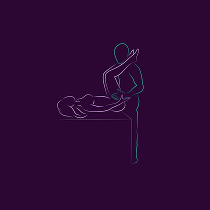 Женщина лежит на спине ближе к краю, ноги могут быть согнуты, партнер стоит у кровати, держа ее за бедра.