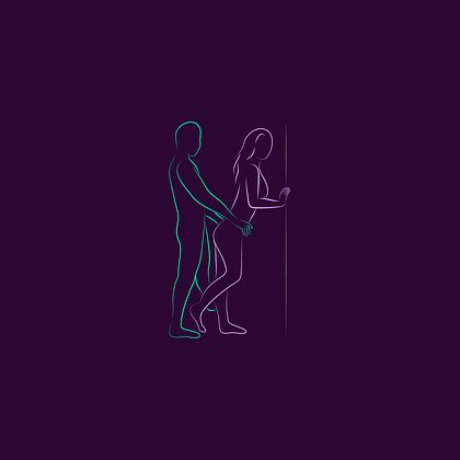 Женщина стоит, слегка наклоняется вперед и кладет ладони на стену, партнер позади, его корпус выпрямлен.