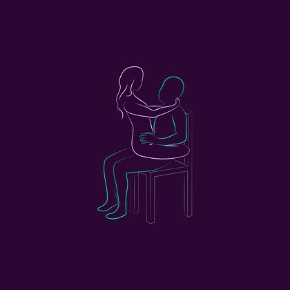 Мужчина садится на устойчивый стул без подлокотников, женщина сверху лицом к нему, обнимает его ногами и держится за плечи.