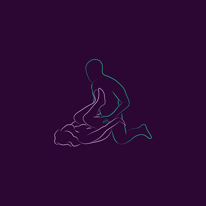 Женщина лежит на животе, таз слегка приподнят, мужчина сверху, опора на колени.