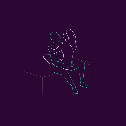 Мужчина сидит на краю кровати, партнерша сверху лицом к нему, обнимает партнера ногами и держится за его плечи.