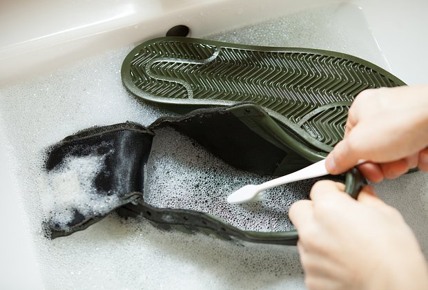 Хозяйственное мыло — это недорогой и эффективный способ освежить тканевую обувь, например, кроссовки.
