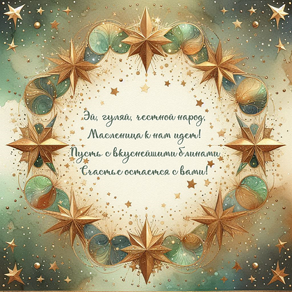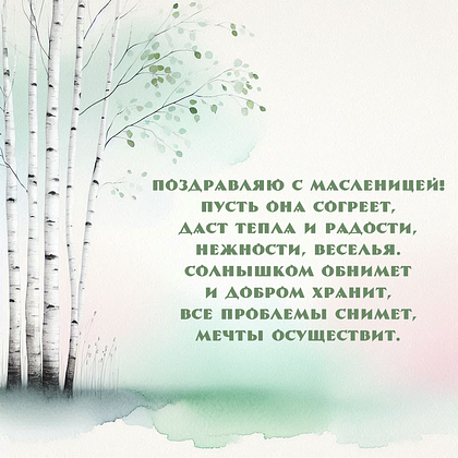 С Масленицей! Пусть в доме будет тепло и уют, а на столе — ароматные блины и любимые угощения. Эта неделя наполняет сердце светом и ожиданием весны. Рядом будут те, с кем легко смеяться и делиться хорошими новостями. В душе поселится спокойствие и тихая радость.