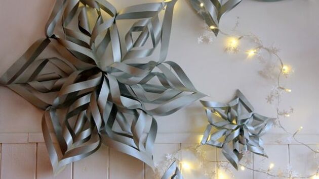 1. Объёмные снежинки своими рукамиЧтобы сделать такую объёмную снежинку своими руками, потребуются серебристая бумага, ножницы и клей. Собирать декор мы будем по частям: на одну большую и две маленькие снежинки нужно шесть листов формата А4. Как сделать снежинку из бумаги своими руками? Для начала возьмите лист, согните его по диагонали и отрежьте лишнее, чтобы получился ровный квадрат. Сложите лист в треугольник по обозначенной линии, затем — ещё раз пополам и сделайте сбоку надрезы, отступив примерно сантиметр или два от края. Разверните лист: у вас в руках должна быть заготовка, как на фото. Подтяните центральные кончики к середине и склейте их обычным ПВА (можно воспользоваться клеевым пистолетом). Повторите тот же приём с третьим и пятым контуром. Затем переверните фигуру и склейте второй и четвертый контуры с противоположной стороны. Готово? Берите следующие заготовки. Шесть таких абстрактных фигур нужно склеить в одну, чтобы получилась объёмная снежинка. Если вы хотите повесить её на стену или гирлянду, пропустите нитку или леску через верхушку снежинки.СМОТРИТЕ ТАКЖЕ…Пошаговый мастер-класс (на английском языке) 2. Снежинки из макаронКакое отношение к Новому году имеют макароны? Самое прямое: из трубочек пенне очень удобно мастерить снежинки — можно сделать украшение любой формы. Попробуйте взять любое изображение снежинки из поисковой выдачи и повторить. Если вы делаете снежинки с детьми, советуем остановиться на вариантах попроще — как на фото выше. Макароны приклеиваются друг к другу с помощью клея-пистолета. После того, как клей схватится, снежинки можно красить акриловыми красками или краской в баллончике. СМОТРИТЕ ТАКЖЕ…Своими руками: Елочные игрушки — поделки из макарон 3. Снежинки-помпоны из тонкой бумагиСледующий мастер-класс требует аккуратности и сноровки. Зато какой результат! Используйте тонкую бумагу тишью холодных «зимних» оттенков: такие объёмные ажурные снежинки будут отлично смотреться на зелёной ёлке. Первым делом расчерчиваем заготовку: нам понадобятся ручки двух разных оттенков (в нашем примере — золотая и чёрная). Отступите три сантиметра от края листа и начертите чёрную полосу, через три сантиметра — золотую, и так пока не закончится лист. Затем возьмите лист бумаги, наложите на заготовку и пройдитесь клеем только по чёрным линиям. Положите сверху следующий лист и обработайте только золотые линии. Продолжайте в том же порядке, пока не закончатся листы (в нашем мастер-классе использовано 36). Начертите на заготовке два полукруга диаметром 16 см и вырежьте их. Приклейте полукруги друг к другу. Теперь нужно вырезать для снежинки ещё два полукруга такого же размера из более плотной бумаги. Приклейте их с двух сторон от заготовки и сшейте по краям ниткой. Узел не должен быть плотным, иначе снежинке будет некуда раскрываться. Заключительный этап: потяните полукруги друг к другу и раскройте свою снежинку! Чтобы она держала форму, закрепите края маленькой скрепкой. Когда праздники закончатся, снежинку можно будет сложить и убрать до следующего торжественного случая. СМОТРИТЕ ТАКЖЕ…Пошаговый мастер-класс (на английском языке) 4. Объёмные снежинки — ещё один вариантСекрет этой снежинки в количестве слоёв бумаги тишью: чем их больше, тем пышнее будет декор. Советуем начать с тридцати: сложите их ак
