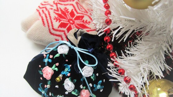 Вам потребуется: Кусочек бархата размером предполагаемого мешочка. Ткань такого же размера как и бархат, для внутреннего слоя ( я взяла вуаль персикового цвета). Ленты для вышивания (около 2 м каждого цвета в рисунке мне хватило для моей вышивки и даже осталось) , бисер и бусины для украшения по желанию. Нитки в тон ткани или лент, иглы для шитья и вышивки лентами, ножницы. Шнурок или лента для завязывания. Шаг 1. Начинаем работу с вышивки лентами по бархату. Рисуем схематичный узор специальным карандашом (мелком, мылом) на той части ткани, где будет перед мешочка. Можно нарисовать на кальке и приложить на ткань, чтобы ориентироваться (так делала я). Узор можно выбирать любой — придумывать свои элементы. Я выбрала три простых элемента для вышивки — розы, листочки, французский узел. Шаг 2. Сначала располагаем на ткани основу для роз — это пятиконечные снежинки. Чем длиннее сделаете лучики — тем больше будет роза и больше понадобиться ленты. Я сделала лучи длинной примерно 1 — 1.5. см. Потом берем ленту, на конце делаем узелок, вводим ее в центр этой снежинки и начинаем проводить иглой то под ниткой, то над ней (не протыкая ткани!). Так чередуем (не сильно затягивая, и стараясь не перекручивать ленту на изнанку, чтобы лепестки роз были красивыми) до того момента пока лучи снежинки не окажутся скрытыми кругами ленты. Выводим на изнанку и, закрепив ленту, отрезаем. Роза готова. Таким образом делаем столько роз, сколько задумано по рисунку. Шаг 3. Следующий этап еще легче — вышиваем листочки к розам. Листочки — это просто один стежок лентой (сильно не затягиваем, оставляем объем). Я выполнила листики разными оттенками зеленых лент, чтобы получилось интересней. По моей задумке в рисунке еще у меня простые цветы пятилистники, которые я выполнила стежками (как листики), только из одной точки. Серединку украсила декоративными пайетками с бисером. Шаг 4. Завершающий штрих вышивки лентами — французские узелки. Они просты в исполнении (вот по этому мастер-классу) и красиво заполняют свободное пространство, создавая воздушный фон для цветов. Шаг 5. Вы также можете украсить свой узор бисером и разными бусинами по желанию. Так как у меня мешочек предназначен для новогоднего подарка под елку, я добавила небольшой золотой колокольчик в рисунок, и он приятно звенит, когда мешочек берут в руки. Шаг 6. Когда рисунок лентами завершен, можно приступать к сшиванию мешочка. Я делала так: сложила лицевыми сторонами ткани — бархат и вуаль, сшила по краям, оставив небольшое отверстие сбоку. Вывернула, таким образом спрятав изнанку вышивки и срезы, и сшила по бокам, предварительно с каждой стороны, отступив по 2 см от верхних краев мешочка и вставив петельки из ленточки между боковыми сторонами— чтобы продевать ленту-завязку. Для большего удобства на нижнем сгибе-дне внутри прошила поперек уголочки. Удобный и изящный мешочек готов!