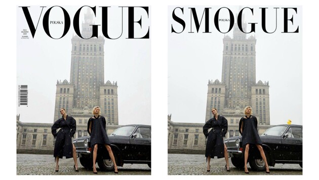 Читатели отметили, что первая обложка польского Vogue слишком напоминает советские журналы – польские модели Малгоша Бела и Аня Рубик сняты на фоне варшавского Дворца культуры и науки, завершенного в 1955 году, и черной «Волги» – олицетворяющих для поляков советскую власть. Вопросы у читателей также вызвала национальность фотографа Юргена Теллера – многие поклонники журнала написали, что первую обложку должен был снимать не немецкий, а польский фотограф. Поляки немедленно начали пародировать обложку. На одном из фотомонтажей название журнала заменено на SMOGUE – намек на серьезную проблему с воздухом в Варшаве, а на волге сидит уточка (так называют поляки восьмого президента Польши Качиньского - kaczka по-польски означает «утка»). На другой картинке – варшавские мужчины имитируют позы Белы и Рубик. Директор новых рынков и развития бренда издательства Condé Nast International Карина Добротворская отметила в посте в своем Instagram, что обложка – не дань, а скорее аппроприция советских символик – периода оккупации страны для многих современных поляков. Фото является референсом на обложку журнала Przyjażn («Дружба») за март 1960 года работы фотографа Ромуальда Бронярека – на ней изображена та же высотка и «Волга», правда более старой модели. По словам Добротворской, таким образом журнал старается избежать ностальгии, и использовать советские символы как путь к дальнейшему развитию.