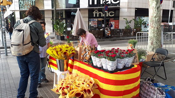 БАРСЕЛОНА, 23 апр – РИА Новости, Елена Шестернина. Барселона 23 апреля отмечает один из самых ярких праздников – Сан-Жорди, день покровителя города Святого Георгия. В этом году он отличается от всех предыдущих – глубокий политический кризис повлиял даже на праздник книг и цветов. Женщине — цветы, мужчине — книгу ЮНЕСКО провозгласила 23 апреля Всемирным днем книги и авторского права в 1996 году. В Барселоне традиция дарить в этот день (23 апреля – дата смерти Сервантеса и Шекспира) книги появилась почти век назад – в 1927 году. К тому же 23 апреля — день покровителя Барселоны святого Георгия (Сан-Жорди). В IV веке, гласит легенда, святой Георгий победил дракона своим копьем. На месте, где пролилась кровь чудовища, выросли розы, и самую красивую из них Георгий подарил своей возлюбленной – дочери короля. По традиции, мужчинам в этот день дарят книгу, а женщинам – красную розу. Впрочем, сейчас и женщины имеют шансы получить в подарок книгу. Книжный магазин в день Сан-Жорди в Барселоне Пять километров книг Центр Барселоны 23 апреля превращается в огромный цветочно-книжный магазин. Палатки с книгами занимают около пяти километров, сотни тысяч людей приходят, чтобы приобрести книгу в подарок, десятки писателей подписывают свои произведения прямо на улицах. Очередь в сетевой книжный магазин растянулась на несколько сот метров. В течение одного дня в Барселоне продается около полутора миллиона книг, доходы от продаж достигают 20 миллионов евро — четверть годовых доходов книгоиздателей. 23 апреля – рабочий день, но складывается впечатление, что весь город не работает, а занимается покупкой книг. Продажа цветов в день Сан-Жорди в Барселоне Желтые розы В этом году Сан-Жорди отличается от предыдущих: последствия бурных политических событий в Каталонии последних месяцев сказались даже на абсолютно неполитическом празднике. К красным розам прибивались желтые — цвета движения за освобождение, в котором участвуют политики, арестованные в связи с незаконным провозглашением независимости автономного сообщества от Испании. Желтые розы приколоты к одежде многих жителей каталонской столицы. Мэр Барселоны Ада Колау на завтраке с писателями тоже говорила о политике. "Это необычный Сан-Жорди из-за политической ситуации", — заявила она с трибуны, напомнив, что два лидера общественных организаций с именем покровителя Барселоны Жорди Куишар (возглавляет Omnium Cultural) и Жорди Санчес (ныне депутат каталонского парламента, ранее возглавлял "Каталонскую национальную ассамблею") находятся в тюрьмах. "Сан-Жорди красивый праздник, когда Барселону наполняют любовь, цветы и книги. Но сейчас мы переживаем непростой политический момент, это первый Сан-Жорди, когда у нас нет правительства", — сказала мэр каталонской столицы РИА Новости. "Обычно в этот день я шла на завтрак в женералитет, но в этом году это невозможно – применена 155-я статья конституции (прямое правление Мадрида в Каталонии — ред.). Есть люди, которые находятся в тюрьмах, в том числе председатель очень важной культурной организации, человек, который очень любит язык и культуру, Жоржи Куишар. Я не выступаю за независимость, но тема демократии волнует нас всех. Я тоже сегодня надела желтую розу. Должен возобладать здравый смысл, надо приложить максимум усилий для диалога. Чрезвычайная ситуация, в которой мы все 
