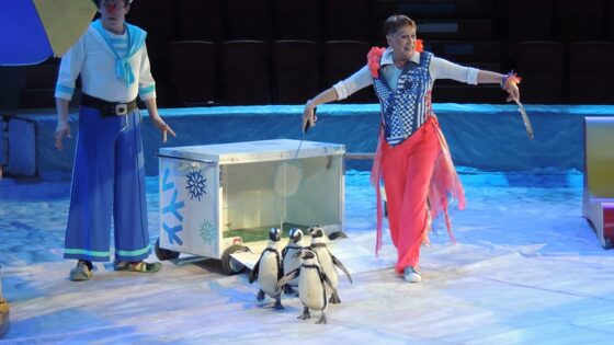 Фото Владимира ШишанинаПтицы высокого полета. В Нижнем Новгороде прошло шоу пингвинов В Нижегородском цирке перед Новым годом появилось настоящее царство экзотики! Деловитые пингвины, словно вышколенные официанты в чёрных фраках, мелкими шажками топают по бордюру вокруг манежа. Морские львицы играют в футбол. Разноцветные попугаи летают над залом, а от крыльев летящего пеликана поднимается настоящий ветер! Кажется, в одном месте собрали всю живность, которая практически не поддаётся дрессировке. Как же всё-таки удалось это сделать? Нашему корресподнету дрессировщики раскрыли секреты самых эффектных номеров. Пингвины без Мадагаскара Шоу пингвинов «Ласта-Рика» стало настоящим новогодним подарком для нижегородских любителей цирка. Вот открывается уличный контейнер для продажи мороженого, и из него появляются… два пингвина Гумбольдта и два очковых пингвина! Очень похожие, они отличаются только светлыми «очками», давшими последним такое смешное название. Галина Майхровская – единственная в мире дрессировщица пингвинов, объехала с ними полмира. С этой группой пингвинов она работает более 10 лет. Звезда её шоу – Цаца из московского зоопарка. Также в аттракционе заняты её друг Боня и пара очковых пингвинов – Рося и Люба. Росю назвали в честь российского флага, которым отмечено крылышко, а Люба получила имя в честь одной из сотрудниц цирка, нежно любившей пингвинов. – О дрессуре с большой буквы говорить здесь не приходится – мы стараемся создать им примерно такие же условия, как в природе. Вот они прыгают по льдинкам-камешкам или ныряют в норки. Из этого и складывается номер. Главное в работе с птицами – любовь, забота и ласка. Когда пингвины хотят показать любовь к человеку, они начинают трясти головой и петь! – поделилась дрессировщица. Пингвины очень привередливы – едят исключительно балтийскую кильку, за которой сотрудникам цирка приходится гоняться по всем магазинам во всех городах! Кроме того, птицам нужны особые условия. Если в зоопарках они живут в специальных вольерах, то пингвинам-путешественникам приходится создавать условия на ходу. Воду для бассейна приходится фильтровать и подсаливать. – Поначалу мы использовали только морскую соль, но её не всегда можно достать. Начали пробовать засыпать обычную. Главное – соблюсти промилле, – уточняет Галина. Выступают с пингвинами и две морские львицы – Пончита и Надя, им почти 20 лет, и дрессировщица уверяет, что они умнее некоторых людей. И если посмотреть в их маленькие пристальные глазки, то легко можно в это поверить. Элегантные морские животные предлагают зрителям коктейли, играют в мяч и громко хлопают ластами друг другу, срывая аплодисменты зала! Новогоднее пингви-шоу «Ласта-Рика» собрало на одном манеже легендарные цирковые аттракционы. Как попугаи Не меньше восторга у зрителей вызывают и красавцы попугаи ара, оперение которых в свете софитов сверкает всеми цветами радуги. Чего только они ни умеют: кататься на миниатюрных велосипедах, делать сальто на обруче, играть в баскетбол… – Попугаи – птицы с интеллектом трёхлетнего ребёнка и с очень крутым характером. Они ничего не делают по приказу и выполняют команды просто из уважения ко мне, – рассказывает дрессировщица попугаев Илона Писарева. Самый сложный трюк – апортировка, когда попугай берёт какой-то пред