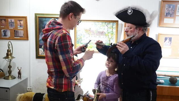 Корреспондент «ВМ» побывал в роли экскурсовода самого таинственного музея Москвы — Музея барона Мюнхгаузена. Более десяти лет назад его создал московский писатель Сергей Макеев, автор нескольких детских книг о легендарном герое. Руководит хранилищем сын писателя — Никита Макеев. — Наш музей — участник многих детских городских олимпиад среди учеников младших классов. Расположен он в одной комнате, в полуподвальном помещении на улице Народного ополчения. И посещение его требует хотя бы прочтения всех похождений барона, — рассказал он «ВМ». Перед экскурсией корреспондент газеты облачился в треуголку и даже взял в руки реконструкции настоящих пистолетов конца XVIII века. Задание оказалось достаточно простым: музей интерактивный, и все в нем разрешается потрогать руками. Естественно, осторожно. — Наша цель — чтобы дети читали книжки, а не увлекались гаджетами. В музее можно посмотреть в бронзовую подзорную трубу, посидеть в кресле Мюнхгаузена. И мы надеемся, что детям больше захочется именно почитать — на это мы делаем главный упор. У нас принципиально нет никаких телевизоров. Вся программа интерактивной экскурсии построена на том, чтобы дети сами двигались, что-то придумывали, вспоминали истории, а не замирали, как зомби, перед экраном! — поделился своим творческим кредо Никита Макеев. Именно поэтому работать с ним в паре очень легко. Вещи говорят сами за себя, а уж выучить все похождения барона совсем просто!