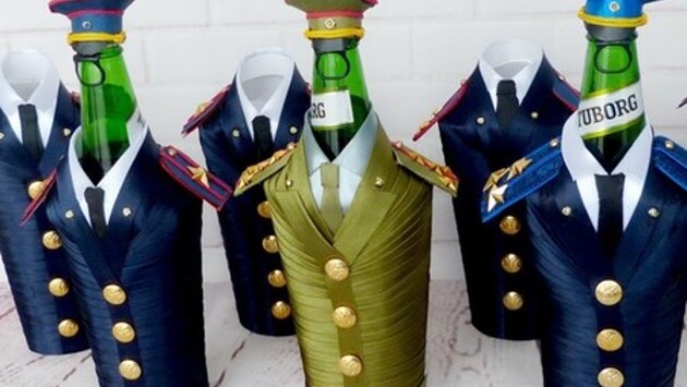 Если вы хотите усилить эмоциональное впечатлениеу мужчин от подаренного вами подарка, то оформите его оригинально. Своей смекалкой и креативом вы поразите вашего избранника в самое сердце. Он непременно оценит не только купленный подарок, но и то время, которые вы потратили, чтобы доставить ему искреннюю радость. Изготовить подарки своими руками на 23 февраля совсем несложно, как своим любимым, так и коллегам по работе, тем более, что процесс изготовления будет сопровождаться пошаговым описанием с фото и видео. От этого творческого процесса вы получите не меньше удовольствия, чем тот, для кого вы так стараетесь. Самим процессом изготовления, а также эффектом от получения такого креативного подарка, вы обеспечите себя большим количеством, так не хватающих нам, положительных эмоций. В данной подборке мы представляем только самые интересные идеи и подробное описание их реализации. yandex_ad_1 Коньяк в торте Торт на самом деле, конечно же, не настоящий, а стилизованный и собранный из настоящих шоколадных сладостей и элементов декора. Такая эффектная подача бутылки коньяка дорого стоит, и есть смысл заняться рукоделием. Потребуется: бутылка коньяка; пенопластовый круг, диаметром 15 см и высотой, равной высоте используемых вами шоколадных конфет; гофрированная бумага насыщенного шоколадного цвета; атласная лента в тон бумаге; узкая золотистая тесьма; горячий клей; шоколадные монетки; любые другие элементы декора. Изготовление: В пенопластовом круглом бруске, с одной его стороны, вырезаем углубление по форме низа бутылки коньяка, приложив предварительно донышко к поверхности пенопласта и обведя его карандашом. Продолжая изготовление подарков на 23 февраля своими руками, вырезаем из гофрированной бумаги два круга, диаметром большим, чем сам круглый пенопластовый брусок, приклеиваем к низу и верху пенопластовой заготовки, подгибаем и приклеиваем края. В месте, где есть выемка для бутылки делаем надрезы, промазываем клеем и заворачиваем их вовнутрь. Дно выемки также прокладываем гофрированной бумагой, закрепляя ее клеем. Полоской гофрированной бумаги, шириной равной высоте бруска, обклеиваем торец нашей заготовки, быстро нанося горячий клей в небольшом количестве на верхнюю и нижнюю окружности. По всему торцу приклеиваем продолговатые шоколадные конфеты, по центру получившейся конструкции приклеиваем атласную ленту, а по ее центру клеим тонкую золотистую тесьму, все концы аккуратно обрабатываем и закрепляем клеем. yandex_ad_2 Бутылку коньяка приклеиваем к дну выемки, всю свободную поверхность заполняем дополнительными элементами декора, например, это могут быть шоколадные трюфели в лепестках разноцветной гофрированной бумаги, посаженные на зубочистку. Шоколадные медальки приклеиваем спереди всей композиции, приклеиваем золотые бусины к элементам декора, подарок на 23 февраля, выполненный своими руками по данному мастер – классу, готов. Танк из носок Не секрет, что самым распространенным подарком для мужчин на 23 февраля являются носки, преподнести их можно в очень интересном оригинальном виде, выполнив этот вариант презентации своими руками, в детском саду на конкурсе ему также найдется достойное место. Потребуется: носки серые – 2 пары; носки черные 2 пары; канцелярские резинки; ручка, как дополнительный подарок; атласная лента. 