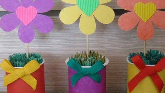 К этому весеннему празднику желательно изготовить некоторое количество различных милых поделок. Ведь подарить подарок, сделанный своими руками, захочется не только маме, но и бабушкам, сестрам, любимым учительницам. Представляем вам красивые поделки к 8 Марта, которые может сделать своими руками все учащиеся начальной школы. Украшение на коробку с конфетами С таким украшением, выполненным руками вашего ребенка, коробка конфет превращается просто в царский подарок для мамы или бабушки на 8 Марта. А главное, результат творчества приведет в восторг самого начинающего мастера. Потребуется: цветная бумага – коричневая, бежевая или светло-коричневая, зеленая; шаблон листка; бумажные салфетки сервировочные – нескольких ярких цветов, а также желтые; ножницы; картон; линейка; степлер; клей. Изготовление поделки пошагово для учащегося начальной школы: На листе бумаги коричневого и бежевого цвета, делаем разметки полос по 1 см шириной, как показано на фото пошагового описания. По полученным разметкам проводим линии, используя линейку. Нарезаем на каждом листе бумаги, указанных двух цветов, полоски по намеченным линиям, не дорезая до края 1 – 2 см. Переплетаем полоски двух цветов. Из картона вырезаем небольшой овал. Размер овала должен позволять свободно вписываться овальной фигуре в габариты имеющейся у вас коробки конфет. Теперь скачиваем шаблон резных красивых листочков, можно использовать разные. Вырезаем листочки по полученным шаблонам из зеленой бумаги. Все листочки приклеиваем в верхней части овала так, чтобы большая их часть находилась вне контура овала. Теперь приступаем к изготовлению цветочков. Складываем друг на друга 5 – 6 салфеток, обводим круг, диаметром 5 см, вырезаем. В центре все слои скрепляем степлером, нарезаем ножницами бахрому по всей окружности. Из желтых салфеток, сложенных в 4 слоя, вырезаем круги по 1, 5 см. Также делаем бахрому и приклеиваем в центре каждого разноцветного цветка. Приклеиваем цветки на листики, а всю конструкцию к коробке с конфетами. Если вы не планируете приклеивать эту цветочную поделку-корзинку к коробке с конфетами изначально, то для овала можно взять более плотный картон. В таком виде поделка также станет отличным подарком к 8 Марта. Выполнить ее своими руками ученик начальной школы вполне может самостоятельно. Букет алых гвоздик Очень эффектная и простая в изготовлении поделка на 8 Марта. Развив эту идею и подойдя к ней творчески, можно изготовить букеты из других разных цветов. Потребуется: бумага гофрированная – любого цвета; картон плотный; салфетки сервировочные красные; клей; ножницы; степлер; атласная лента; кисточка. Изготовление: Каждую бумажную салфетку сворачиваем пополам два раза, скрепляем получившуюся конструкцию степлером. Вырезаем круг из многослойного квадрата круг, нарезаем по всей окружности. Все нарезки распушаем, получаем цветок. Изготавливаем достаточное количество таких цветков, чтобы получился эффектный букет. На картоне рисуем контур букета, выбранного размера. Вырезаем по полученному контуру фигуру по форме букета. Снизу оборачиваем «букет» гофрированной бумагой. В характерном узком месте букета привязываем атласную ленту, завязываем бант. На свободную часть картона приклеиваем приготовленные цветы. Между цветами и по контуру букета – поделки к 8 Марта р