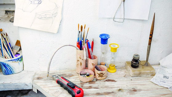 В Музее марципана в парке «Юность» Пётр Торопов бывает не реже, чем в собственной мастерской, — именно здесь мы впервые встречаемся с калининградским художником и скульптором. В музее, который открыла семья Тороповых, Пётр провел пять выставок: «Память парусов», «Старый город», «Причуды королевского стола», «Знаки зодиака» и «Средневековый бестиарий». Таинственные существа из мифов и легенд, архитектурные памятники Кёнигсберга и рецепты старинных поваренных книг нарисованы на марципане специальными пищевыми красителями. — Как художник я мыслю образами, а не датами, но думаю, это было лет десять назад, — смеется художник, вспоминая первый расписанный марципан. — Сашка (дочь Торопова, директор музея. — Ред.) спросила у меня, получится ли нанести роспись. Я решил попробовать и понял, что поверхность марципана схожа с шамотом (обожженная измельченная глина. — Ред.), с которым я много работал еще в студенческие годы. , Приемы работы с шамотом и другими материалами — перечисляет керамику, металл, мрамор, после чего говорит, что легче вспомнить, с чем не работал (со стеклом) — Торопов переносит не только на марципаны, но и на холст. Из-за этого живопись художника иногда называют «холодной керамикой»: смешивая краску с песком разных фракций, он создает на работе микрорельефы, имитирующие поверхность камня, ржавчину, кованый металл или древесину, и добивается трехмерной формы, свойственной скульптуре., Рассказывая об экспериментах, Петр говорит, что любая техника не должна противиться характеру материала: — Для меня важна технологичность. Когда мы только начали заниматься марципаном, думал использовать лепку. Аутентичный рецепт сладости подразумевает обжиг в печи, но оказалось, что во время него рельеф деформируется. Я всегда стараюсь слушать материал: если он заявляет свой характер и говорит, что так делать нежелательно, не делаю. Расписанные художником марципановые диски, с одной стороны, напоминают печатные оттиски, с другой — средневековые гравюры. На них нередко можно встретить и орнамент, который, по мнению Торопова, является универсальной письменностью всех народов. — На Востоке говорят, что орнамент — музыка для глаз, — добавляет художник., Интерес к древним культурам и символикам проснулся у Петра во время учебы в Бакинском художественном училище имени Азимзаде, где он познакомился с восточными миниатюрами и национальными орнаментами. Затем Торопов учился в знаменитой петербургской «Мухе» (Санкт-Петербургская государственная художественно-промышленная академия имени Штиглица, бывшее Мухинское училище. — Ред.), после окончания приехал в Калининград. В разное время реставрировал барельефы и другие скульптурные формы, преподавал каллиграфию в школе восточных единоборств, занимался мозаикой — ее фрагменты можно встретить и на одной из стен мастерской Торопова на зад-нем дворе Дома художника. Заходя внутрь, Петр со словами «западное, как у древних кельтов» зашторивает окно, чтобы лучи солнца не попадали в мастерскую. Осматриваясь, замечаю холст, на котором написано «Солнцеворот». Эта серия, отчасти вдохновленная культурой скифов, показывает бесконечное движение — линий, символов, солнца и луны., Доставая картины, Пётр рассказывает о работе над циклом. В этом ему помогает его супруга, искусствовед Елена Торопова. — 
