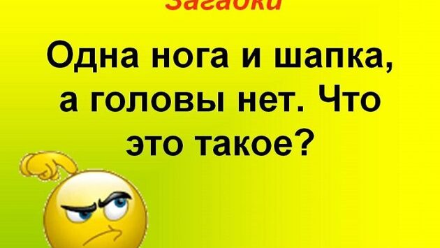 Интересные загадки с подвохом На первый взгляд покажется, что задание выполнит человек, читающий библию или изучающий историю религий. Но ответ на этот вопрос знает даже школьник, просто нужно более внимательно вчитаться в содержание. Вспоминайте, Моисей — тот пророк, который увидел ангела в образе горящего куста, вел народ от изгнания и преодолевал разные препятствия с Божьей помощью. А ковчег строил Ной, и он собирал животных на своем корабле. Следующее задание также на внимание и сообразительность. Человеку лишь нужно вспомнить свойства некоторых природных явлений. Фактически, это школьная загадка по окружающему миру. Какому явлению нужно постоянно себя «кормить», чтобы «насытиться», не пропасть? Конечно, это огонь. Тогда второе явление, которое появляется, а потом исчезает, будет дым. Следующий вопрос также посвящен физическим свойствам предмета. Тоже из школьной серии на внимание. Конечно, что состоит из воды и плавает по ней? Это льдина. Нужно быть внимательным, чтобы увидеть подвох. А для этого вспомните всё, что может быть легче перышка и почему его нельзя удержать даже 10 минут? Речь идет о дыхание, попробуйте, сможете удержать его 10 минут, если вы не пловец. Шуточная загадка о предмете, который есть у всех: только у одной категории лиц на постоянной, у других — на временной основе. Уж если порассуждать логически, то предмет состоит из двух частей: первая часть основная «верхом», вторая из «ног» за ушами... Что же может быть за ними? Очки! Вопросы о свойствах предметах полезны не только взрослым, но и детям. Вспоминайте, какой предмет абсолютно не нужен, если лежит «на спине», а «стоя», именно к стене, просто необходим? Конечно, это лестница. Помним, что все загадки на логику и сообразительность, а не на математическое вычисление. На этот вопрос не ответит лишь тот, кто никогда не видел электричек, у которых совсем нет дыма. Ответ на этот вопрос будет известен всем, только не каждый человек сконцентрирует на этом внимание. А теперь вспомните, какая вещь стала настолько востребованной у населения, чего не было лет 15-20 назад? Конечно, речь идет о смартфонах и телефонном звонке. Чтобы вы не ответили «алло», «да», «на связи», собеседник будет давать ответ, хотя вы этого не спрашивали. С этим заданием сможет справиться дошкольник, если порассуждает логически: когда он может увидеть всё и когда не видит ничего? Тогда и получит ответ, что ночью видно только одну темноту. Загадка со школьных лет. Ранее дети перечисляли все виды камней, которые можно встретить в реке. А ответ лежал на поверхности. В реке нет сухих камешков. Не нужно знать физику или математику, чтобы распределить два литра молока в литровую банку. Обратите свой взгялд в потребительское использование. Вспомните, что можно сделать из молока и какой консистенции получается продукт. Поэтому из двух пачек молока делаете творог, который как раз по объему умещается в эту литровую баночку. Такие шуточные загадки расширяют кругозор у детей, а взрослым помогает скоротать весело время. Ведь действительно, смешно, когда мужчины или женщины не могут разгадать школьную загадку или иначе видят ответ в двусмысленной интерпретации.