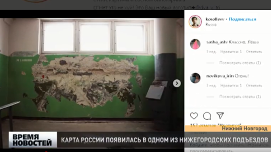 Если раньше в подъездах рисовали цветы, персонажей из любимых сказок или, на худой конец, оставляли интересные надписи, то сейчас полет фантазии довел до карты. Как только художник выложил фото работы на своей странице в социальной сети, на него тут же посыпался шквал критики. Но Алексей Королев не расстраивается. Ведь он хотел украсить подъезд, а точнее что-то сделать с обвалившейся штукатуркой. Хотел как лучше, а получилось? Работа называется «Масштабы». На карте красным знаком отмечен Калининград. Только жильцы дома не поняли, что это такое и зачем такое творчество появилось в подъезде. Мы отправили запрос в домоуправляющую компанию с вопросом, нарушается ли в этом случае законодательство. Дом обслуживает домоуправляющая компания Канавинского района. И пока жители подъезда с просьбой избавиться от граффити туда не обращались. Россия остается в подъезде.