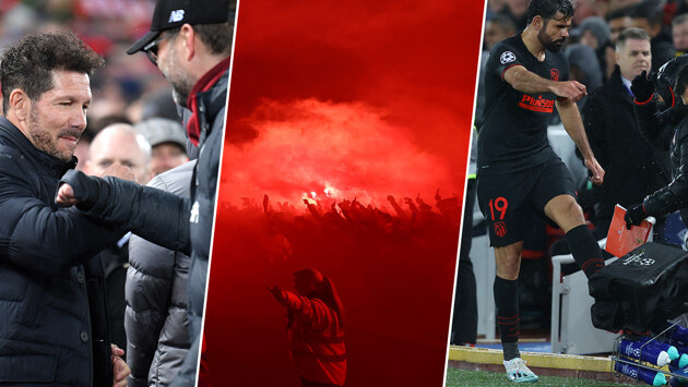 Пирошоу у «Энфилда», вирусное приветствие тренеров и злость Косты. Фото победы «Атлетико»