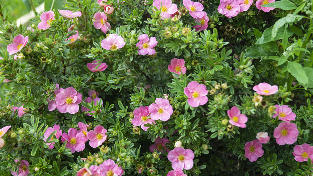 Лапчатка кустарниковая (курильский чай) — нетребовательный кустарник, отличающийся зимостойкостью и очень длинным периодом цветения. Практически все лето растение будет оставаться декоративным, не требуя взамен особого внимания с вашей стороны. Выведено много разновидностей этой культуры, различающихся по габаритам, форме куста и окраске цветков. Рассмотрим популярные сорта. Лапчатка кустарниковая с розовыми цветками Сорта с желтыми цветкамиДикорастущие лапчатки цвели исключительно желтыми цветками. Потому считается, что сорта, сохранившие природную окраску соцветий, наиболее выносливы. В настоящее время выведено много культурных разновидностей, украшающих сады цветками различных оттенков аутентичного желтого цвета. 'Goldfinger'Один из самых распространенных и популярных сортов. Отличается неприхотливостью, нетребовательностью к почве и стойкостью к засухе и зимним морозам (3-я зона зимостойкости). Цвести начинает в июне — и продолжает до конца сентября. При нехватке влаги цветение становится реже, но после хорошего дождя 'Goldfinger' вновь усыпан яркими цветками. Куст прочный, формируется прямостоячими побегами. Хорошо поддается стрижке, поэтому пригоден для создания живой изгороди. Диаметр цветков — 2,5 см, куст округлый, его высота около 130-140 см, диаметр — 150 см. Лапчатка кустарниковая Golgfinger 'Goldstar'Эта разновидность давно известна садоводам и заслуживает похвалы. 'Goldstar' можно отнести к надежным и долговечным сортам, которые не требуют особого внимания летом и не замерзнут зимой (3-я зона). Обильно цветет с июня по октябрь золотисто-желтыми цветками, диаметр которых достигает 5 см. Куст формируется тонкими прямыми побегами, имеет подушковидную форму. Высота — около 1 м, диаметр до 1,2 м. Лапчатка кустарниковая Goldstar 'Elizabeth'Невысокий кустарник с подушковидной густой кроной, будет уместен в любом саду. Неприхотлив, зимостоек (3-я зона), хорошо растет на плодородных суглинках, но по сути не требователен к типу почвы. Стабильно декоративен: начинает цвести в мае и радует хозяина яркими желтыми цветками диаметром до 4 см до самой осени. Диаметр куста может быть больше высоты в 2 раза при средних значениях 1-1,2 м и 0,6-0,8 м соответственно. Лапчатка кустарниковая Elizabeth Другие интересные сорта с желтыми цветками — 'Kobold', 'Goldteppich', 'Tangerine'. Сорта с белыми цветкамиЛапчатки кустарниковые с белыми цветками, как правило, более низкорослые и требовательные к содержанию по сравнению с желтоцветковыми. Некоторым нужно укрытие на зиму, особенно в молодом возрасте. Более подробно познакомиться с ботаническими особенностями лапчаток и правилами ухода за ними вы можете, прочитав публикации Курильский чай для вашего сада и Лапчатка кустарниковая — золотистый кустарник для дачи. Лапчатка кустарниковая среди камней 'Abbotswood'Этот сорт можно считать самым популярным из белоцветковых. Он довольно устойчив к погодным неприятностям, переносит засуху и может оставаться декоративным даже в городских условиях. К почве не требователен, на солнечных участках цветет обильнее, но может мириться и с полутенью, относится к 4-й климатической зоне. Имеет округлую форму куста и вырастает до 1 м в высоту и до 1,3 м в диаметре. Белоснежные цветки (около 3 см) начинают распускаться в начале июня, заканчивается цветение с наступлением холодов. Лапчатка кустарниковая Abbotswood 'Snowflake'Ве