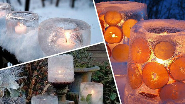 Удивительными ледяными подсвечниками можно украсить садовые дорожки, лестницу на крыльце или расставить у ворот. Они ничего не стоят, а выглядят очень стильно. Попробуйте сделать такие у себя на участке, это очень легко. Вам понадобятся две консервные банки разного размера или два ведерка (если хотите сделать большой подсвечник). Также можно использовать большие контейнеры из-под мороженого, йогурта или майонеза (1,5 и 2 л). В меньший контейнер добавьте немножко камней для веса, а большой заполните водой на 2/3. Поместите меньший контейнер с камнями в больший. Используйте клейкую ленту или малярный скотч, чтобы закрепить меньший контейнер за края большего. Обратите внимание, маленький контейнер не должен касаться самого дна большего. В получившуюся полость между банками можно добавить ягоды, ветки хвои или веточки тимьяна или розмарина, которые продаются сейчас в супермаркетах. Ну а можно оставить его кристально чистым. Поставьте контейнеры на ночь в морозильную камеру. Если они слишком большого размера, вынесите просто на улицу, на мороз. Когда вода замерзнет, наполните внутренний контейнер холодной водой. Этого должно быть достаточно, чтобы освободить его ото льда. Можно также включить холодную воду, чтобы вытащить внешний контейнер. Не используйте горячую, лед потрескается! Теперь ледяной подсвечник готов. Положите внутрь светодиодную лампочку, а если подсвечник получился большой, то можно поставить внутрь баночку с настоящей свечой. Понравилась идея? Также можно изготовить и ледяные рюмки для зимней вечеринки!