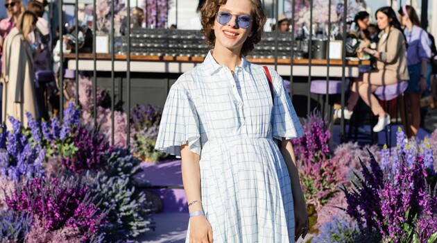 Беременная Арзамасова пришла на вечеринку на крыше в платье в клетку виши