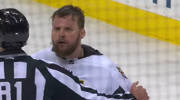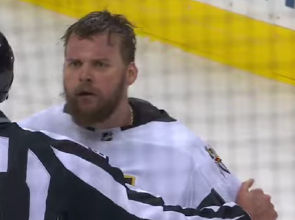 В концовке матча «Нью-Джерси» – «Вегас» произошла массовая потасовка. Ленер скинул шлем и хотел поучаствовать, но был остановлен судьей